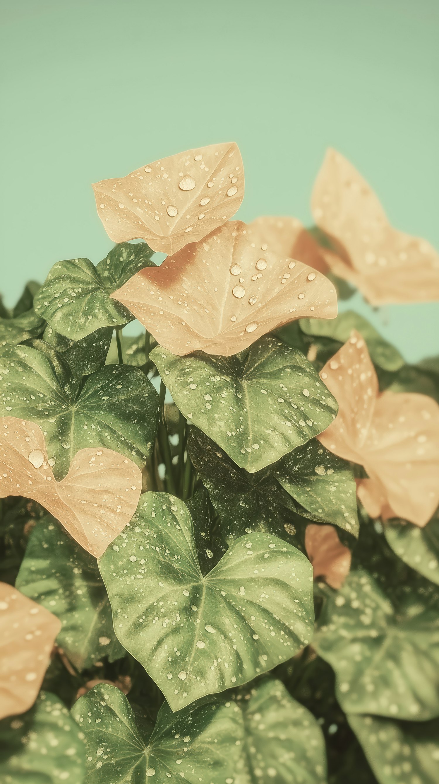 Close-up of tropical leaves with water droplets, blending green and peach tones against a pastel teal background. Fresh and serene vibe.