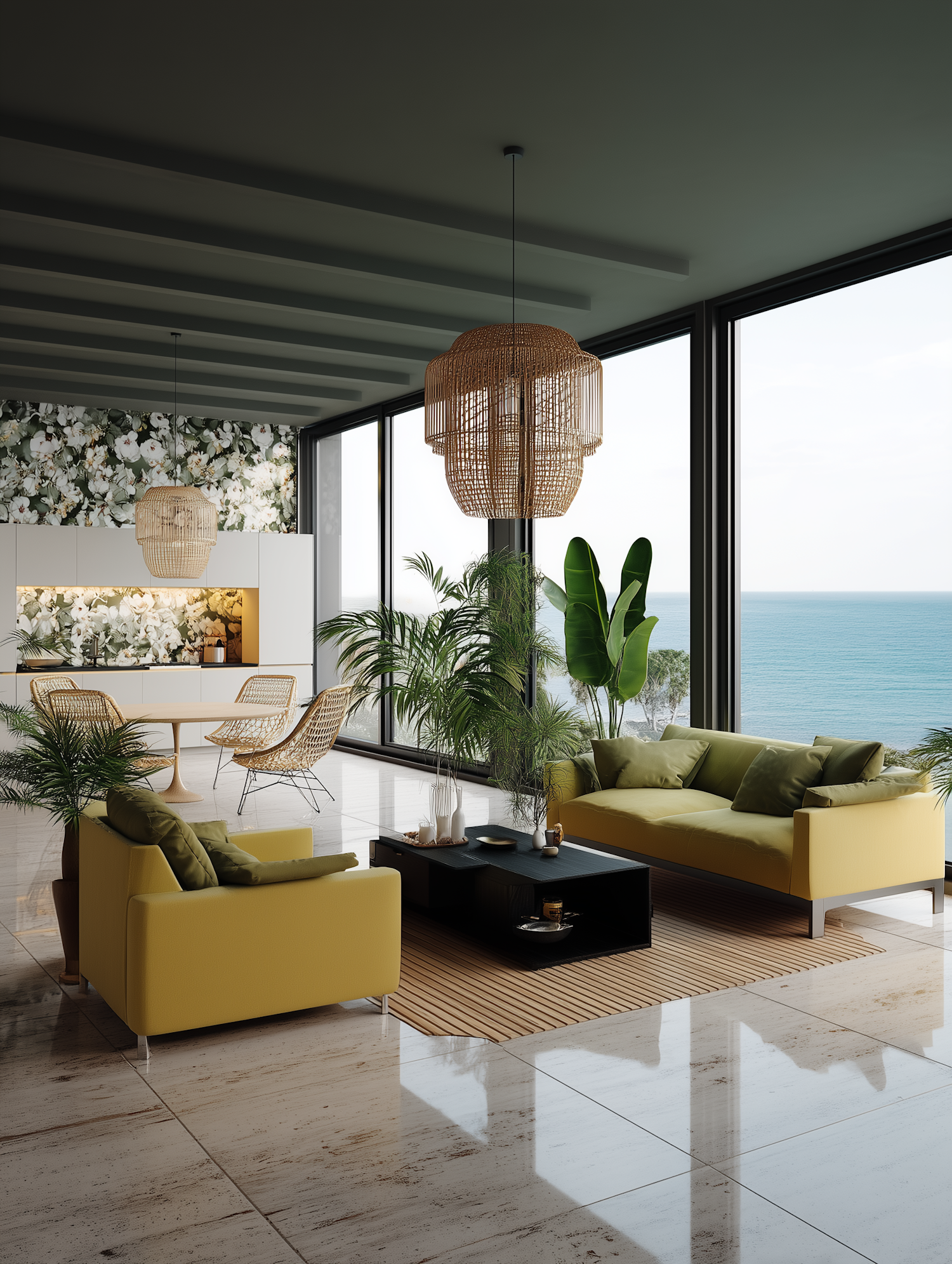 Bright living room with yellow sofas, lush plants, and ocean views. Features wicker accents, floral wall, and modern coastal decor.