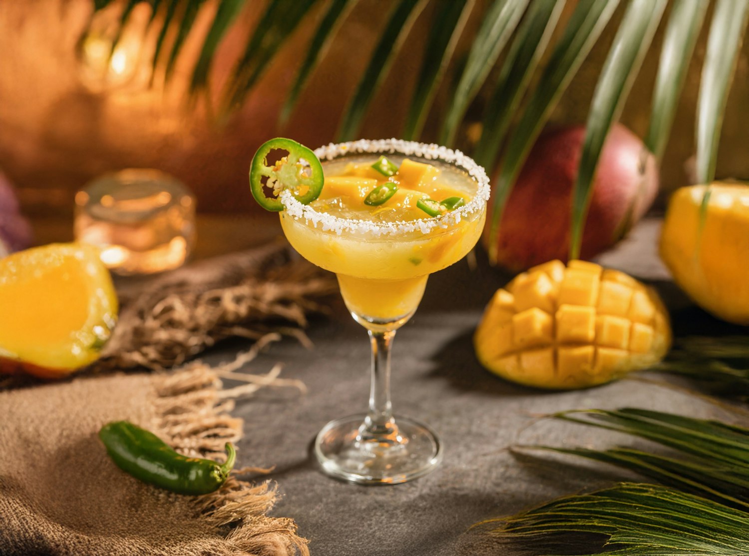 A tropical mango margarita with jalapeño garnish, served in a salted-rim glass, surrounded by fresh mangoes and palm leaves.