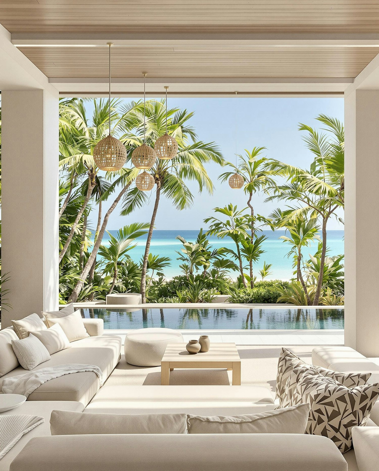 Luxurious open-air living room with tropical views, featuring white furniture, an infinity pool, and lush palm trees by the ocean.