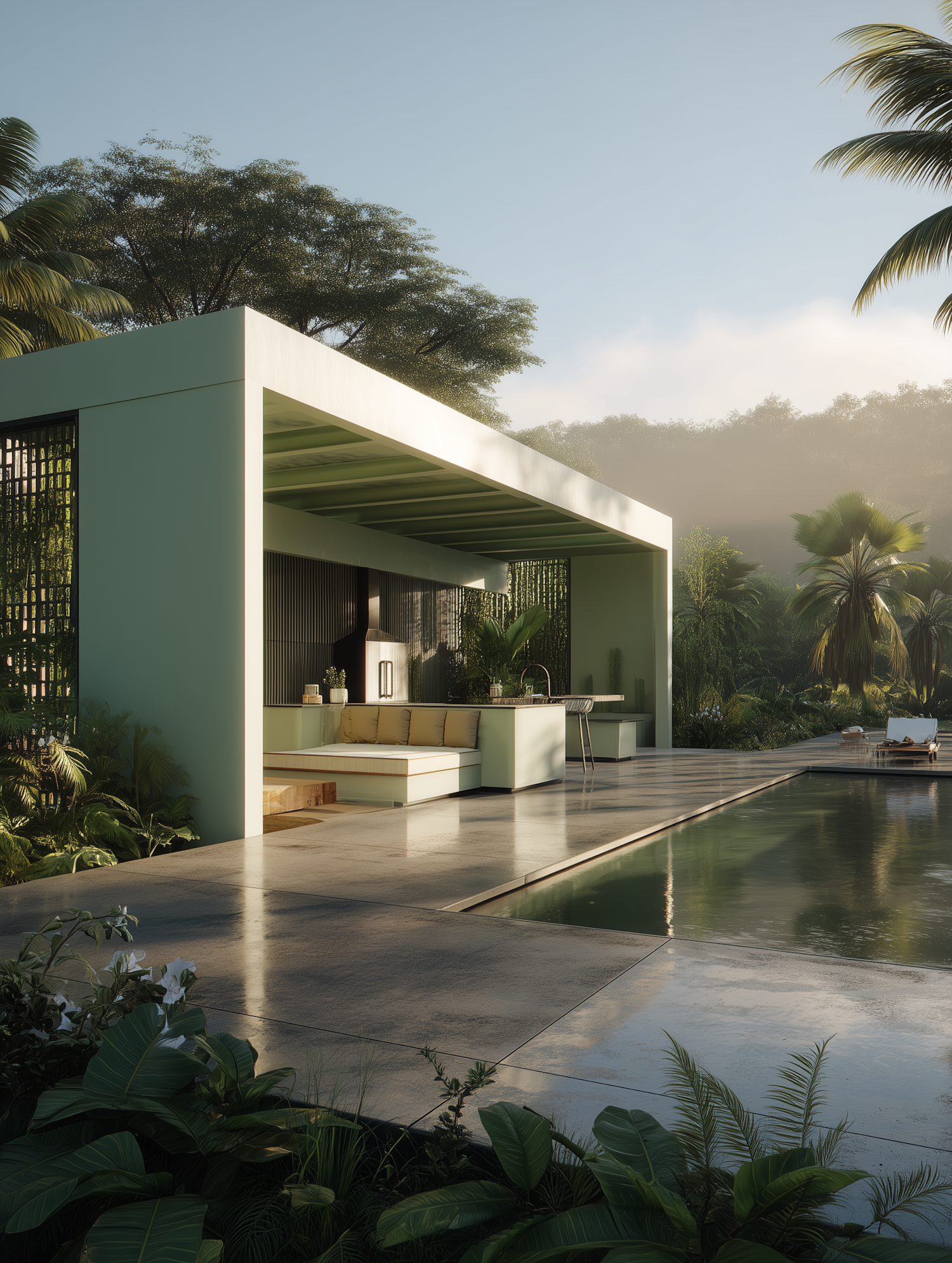 Modern outdoor pavilion with a pool, lush greenery, and sleek design. Perfect for a tropical retreat or luxurious relaxation.