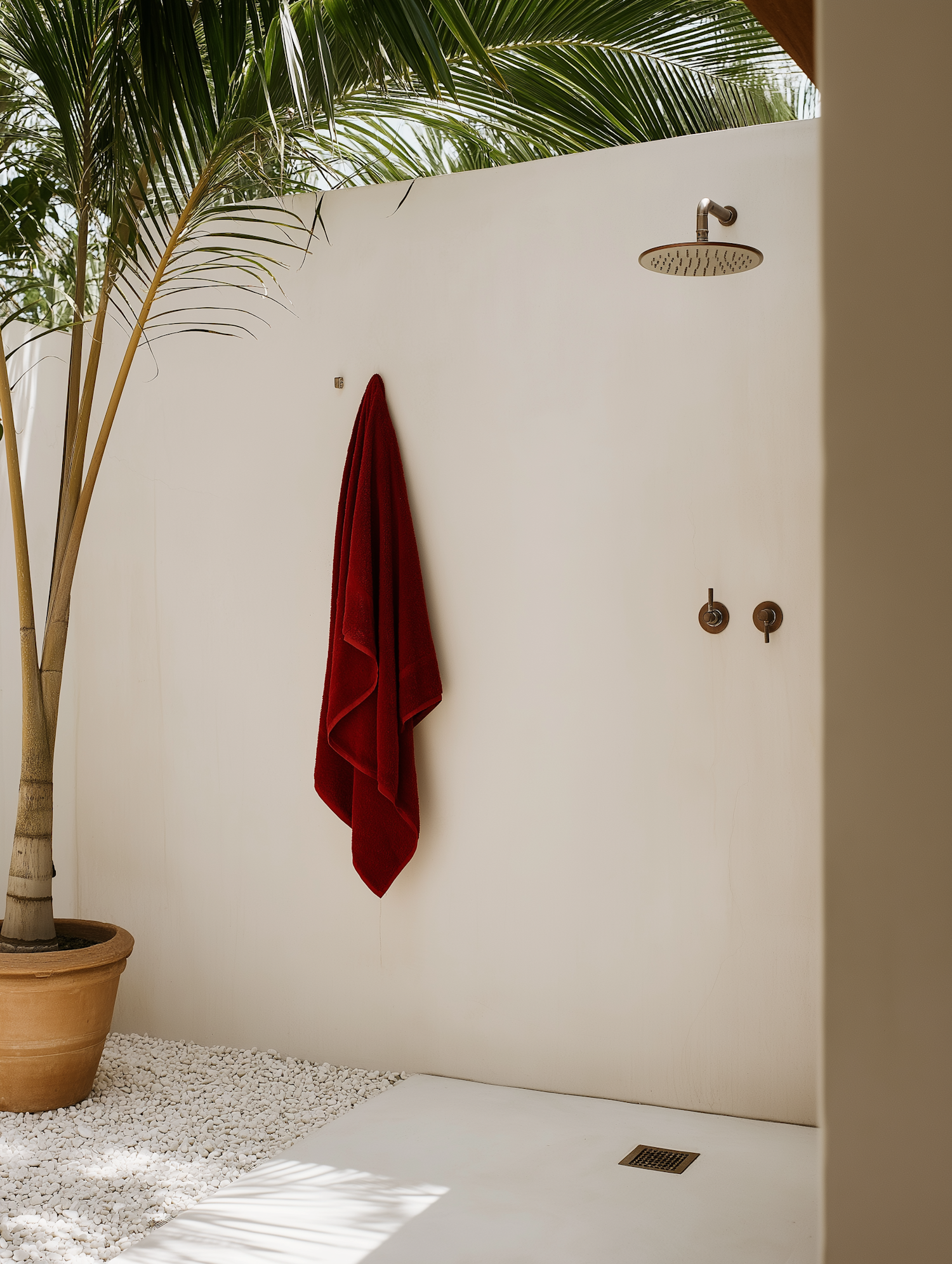 Minimalist outdoor shower with a red towel, white pebbles, and tropical palm tree. Perfect blend of modern and natural design.
