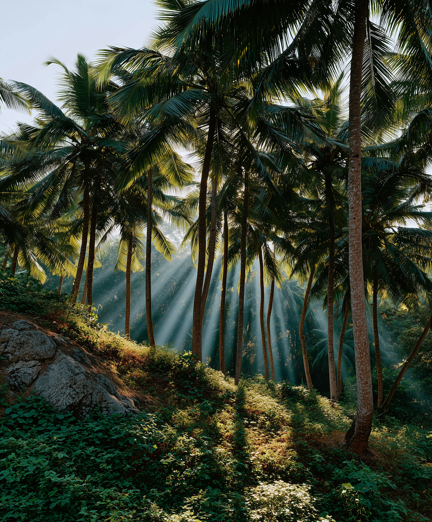 Sunlight streams through tall coconut palms, casting shadows on lush greenery and creating a serene tropical forest scene.