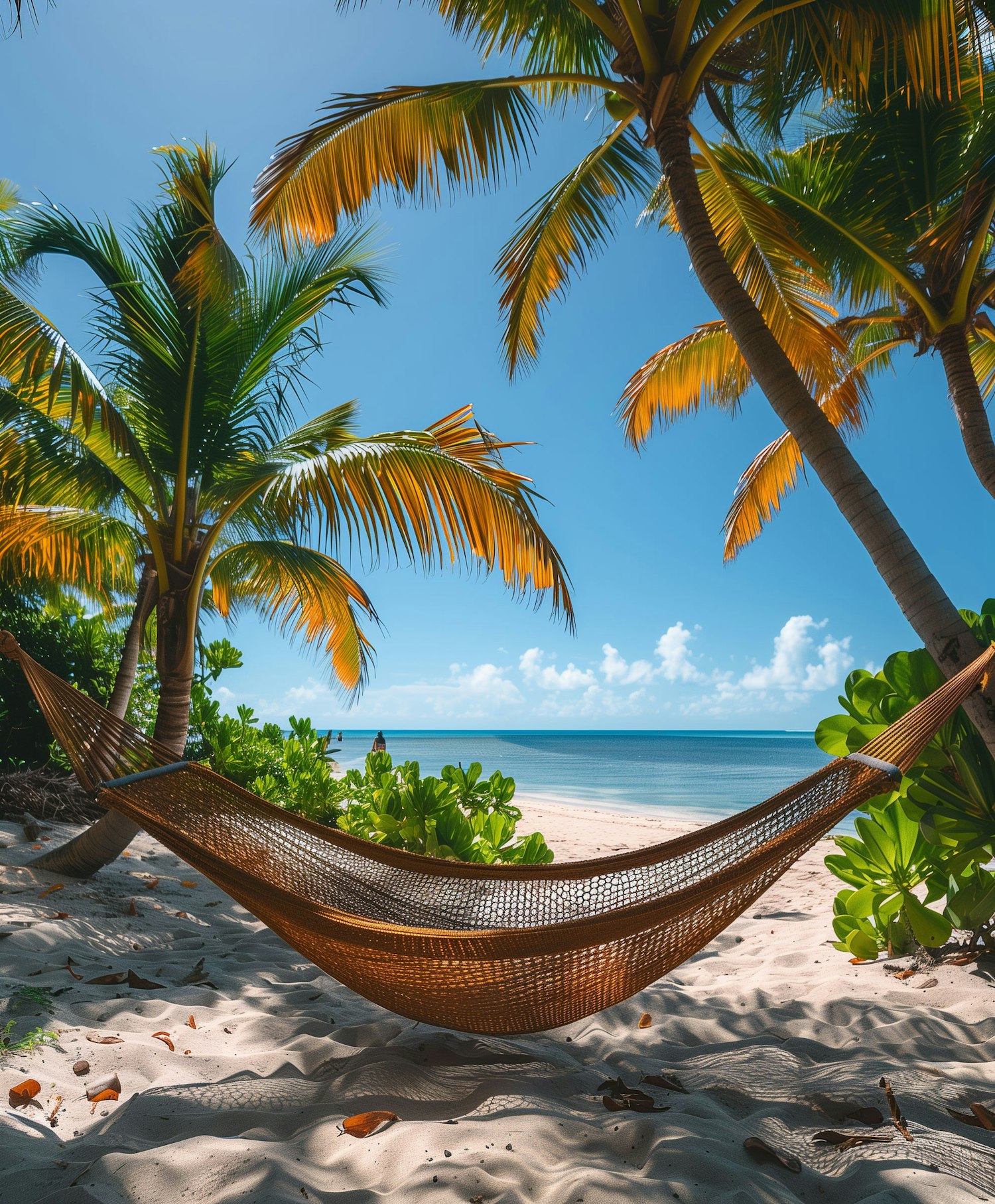 Relaxing beach scene with a hammock between palm trees, golden sand, and a calm ocean under a clear blue sky.