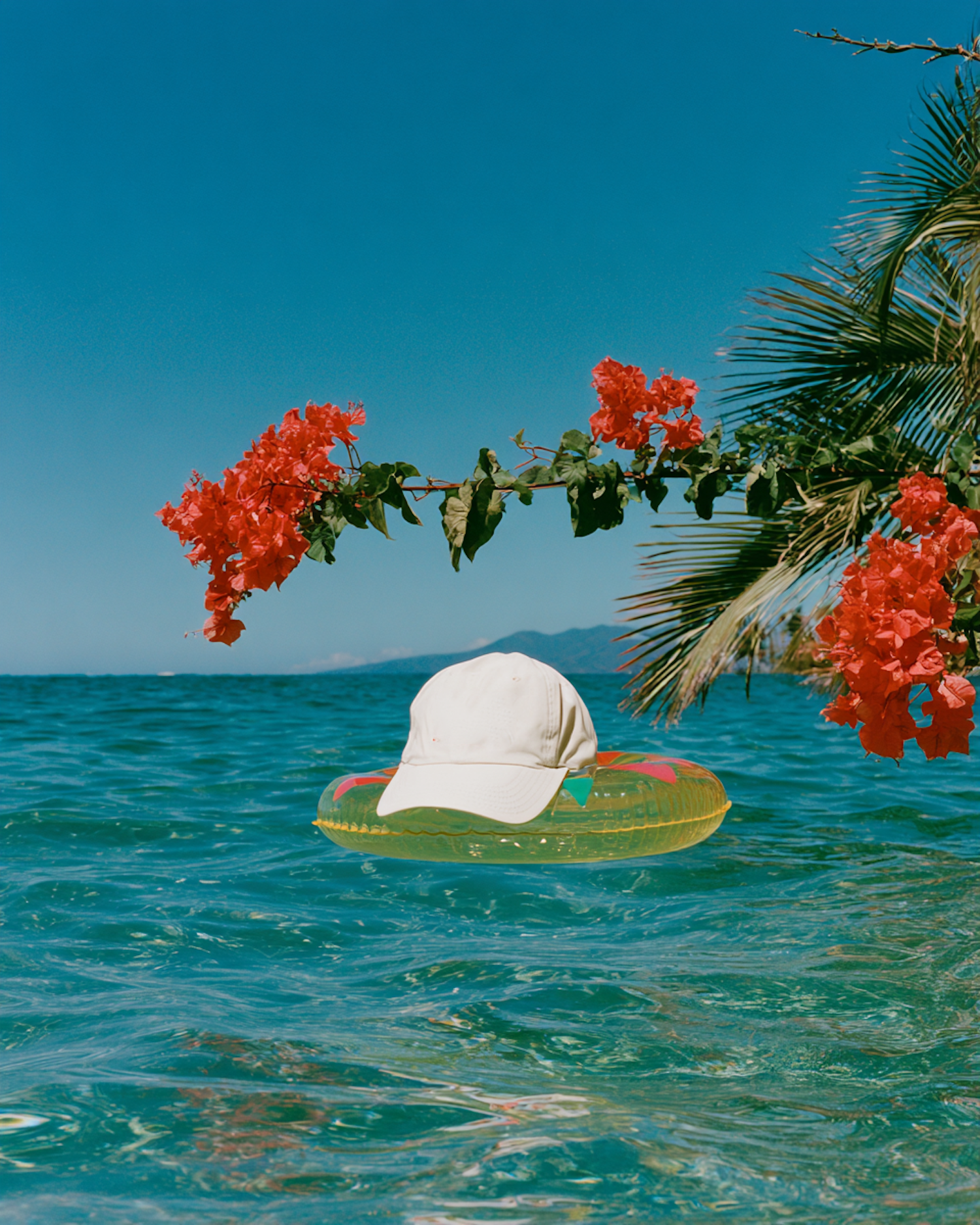 A white cap on a colorful float in turquoise water, framed by red flowers and palm leaves under a clear blue sky.