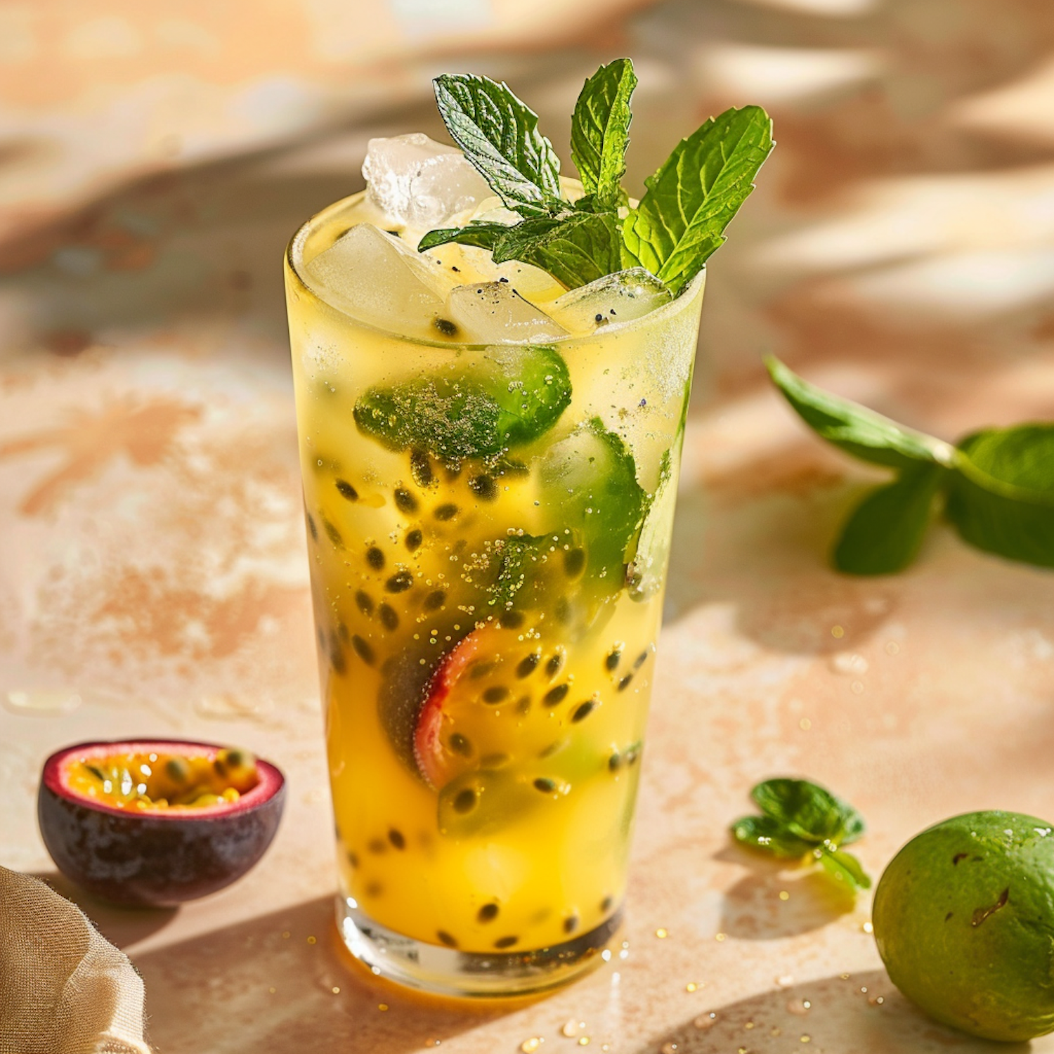 Refreshing tropical drink with passion fruit, mint, and lime in a tall glass, perfect for a sunny day.