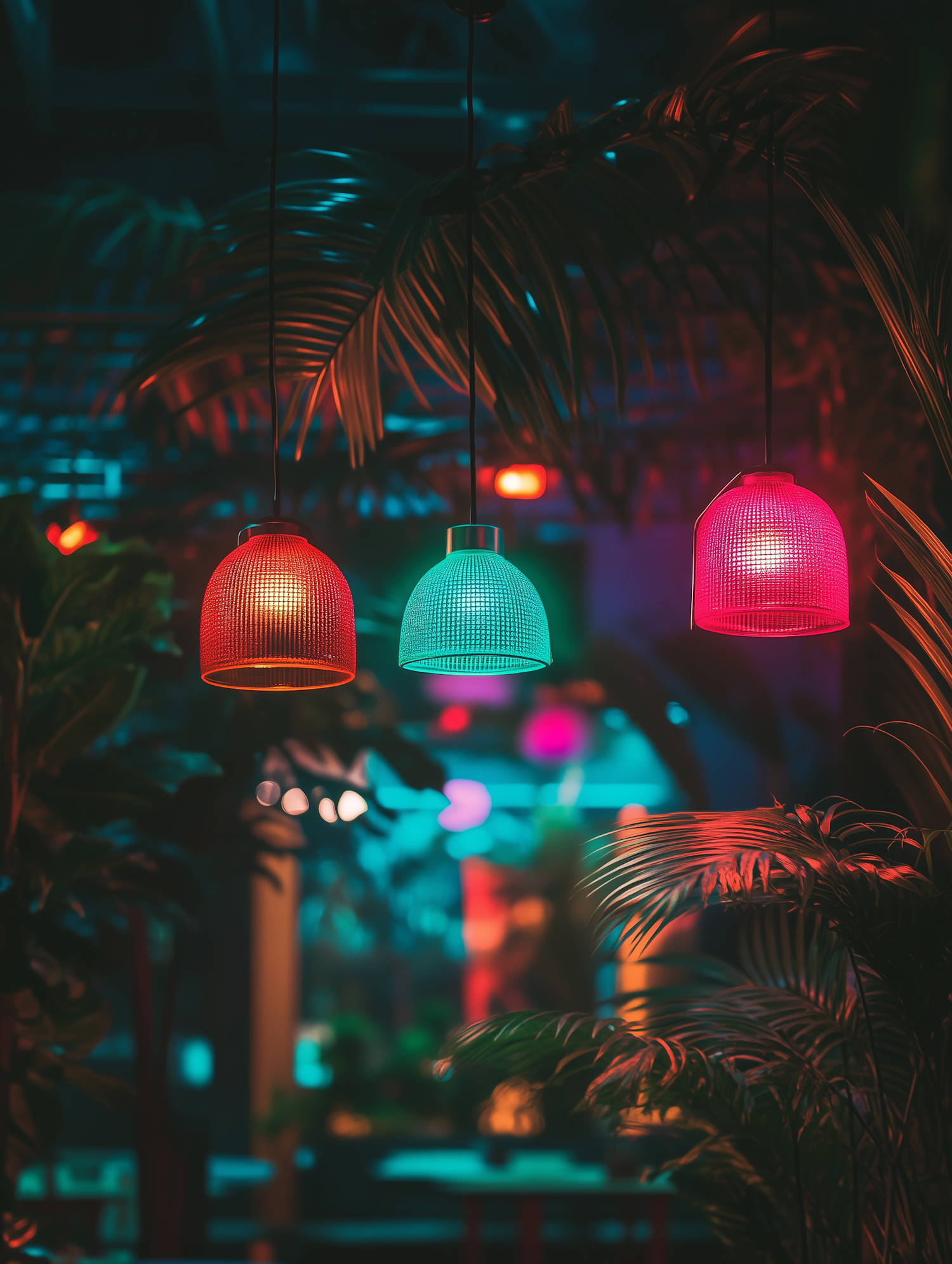 Colorful pendant lights in red, green, and pink glow amid tropical palm leaves, creating a cozy, vibrant bar or lounge atmosphere.