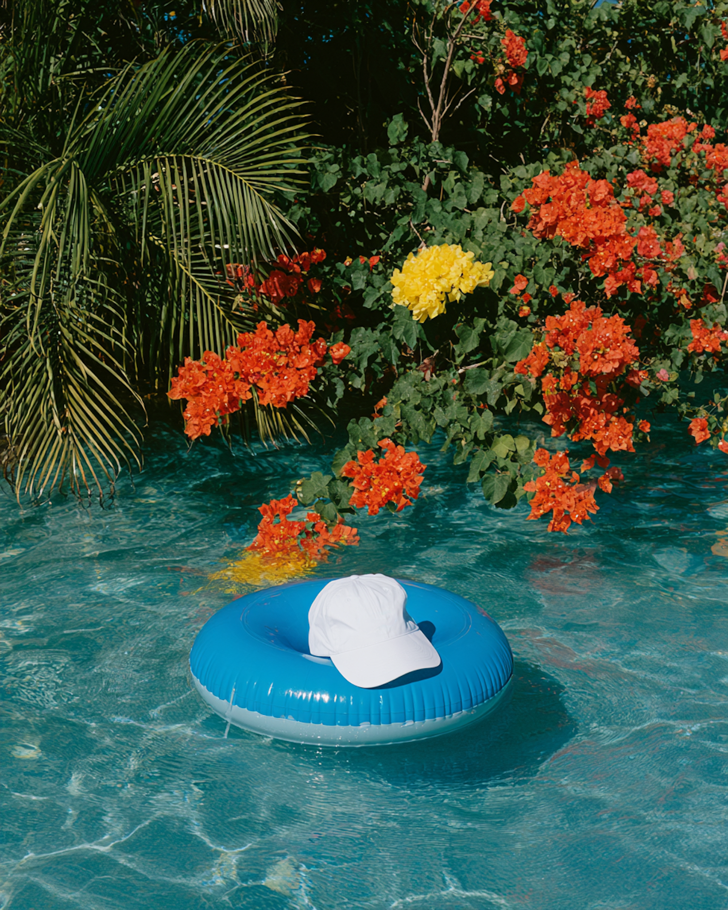 A blue pool float with a white cap drifts in a clear pool, surrounded by lush greenery and vibrant red and yellow flowers.