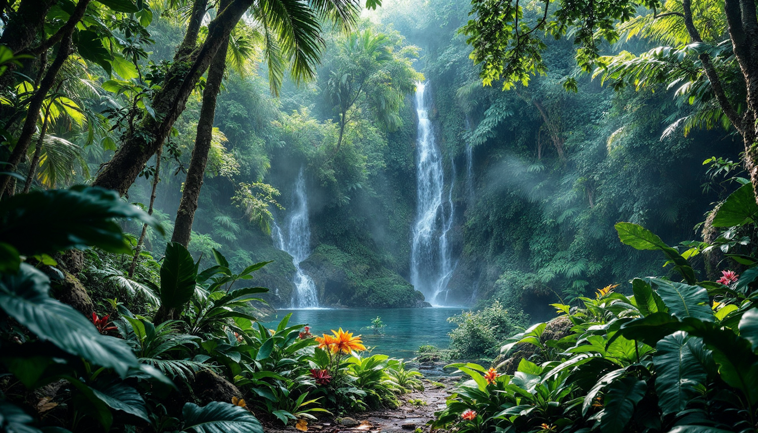 Lush rainforest with a cascading waterfall, vibrant foliage, and colorful flowers. Sunlight filters through, creating a mystical atmosphere.