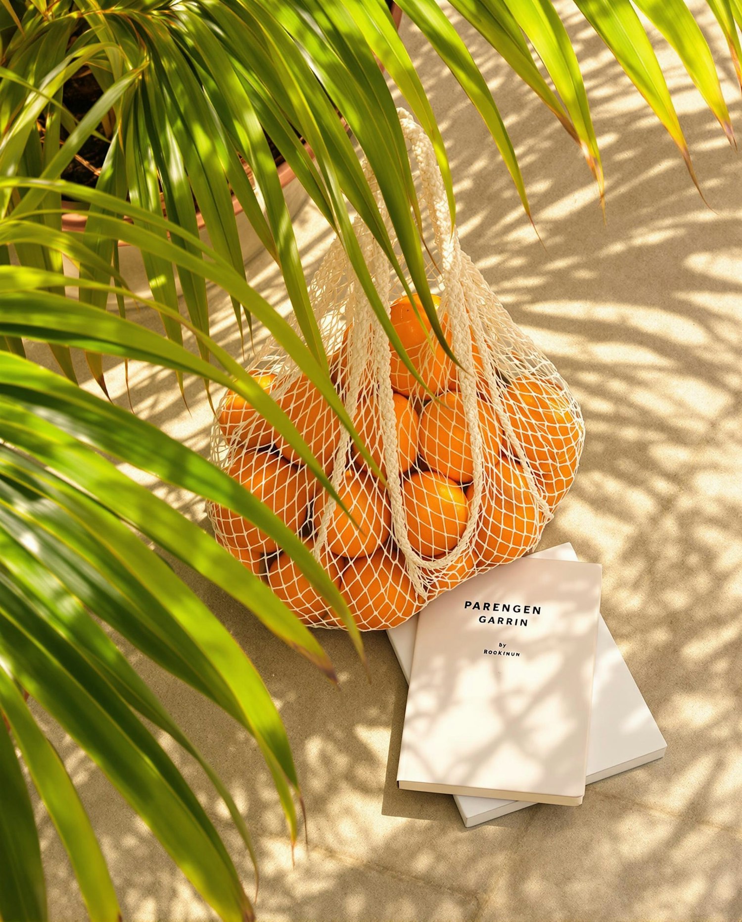 A mesh market bag with oranges and a book lying next to a palm leaf on a stone terrace, warm afternoon light