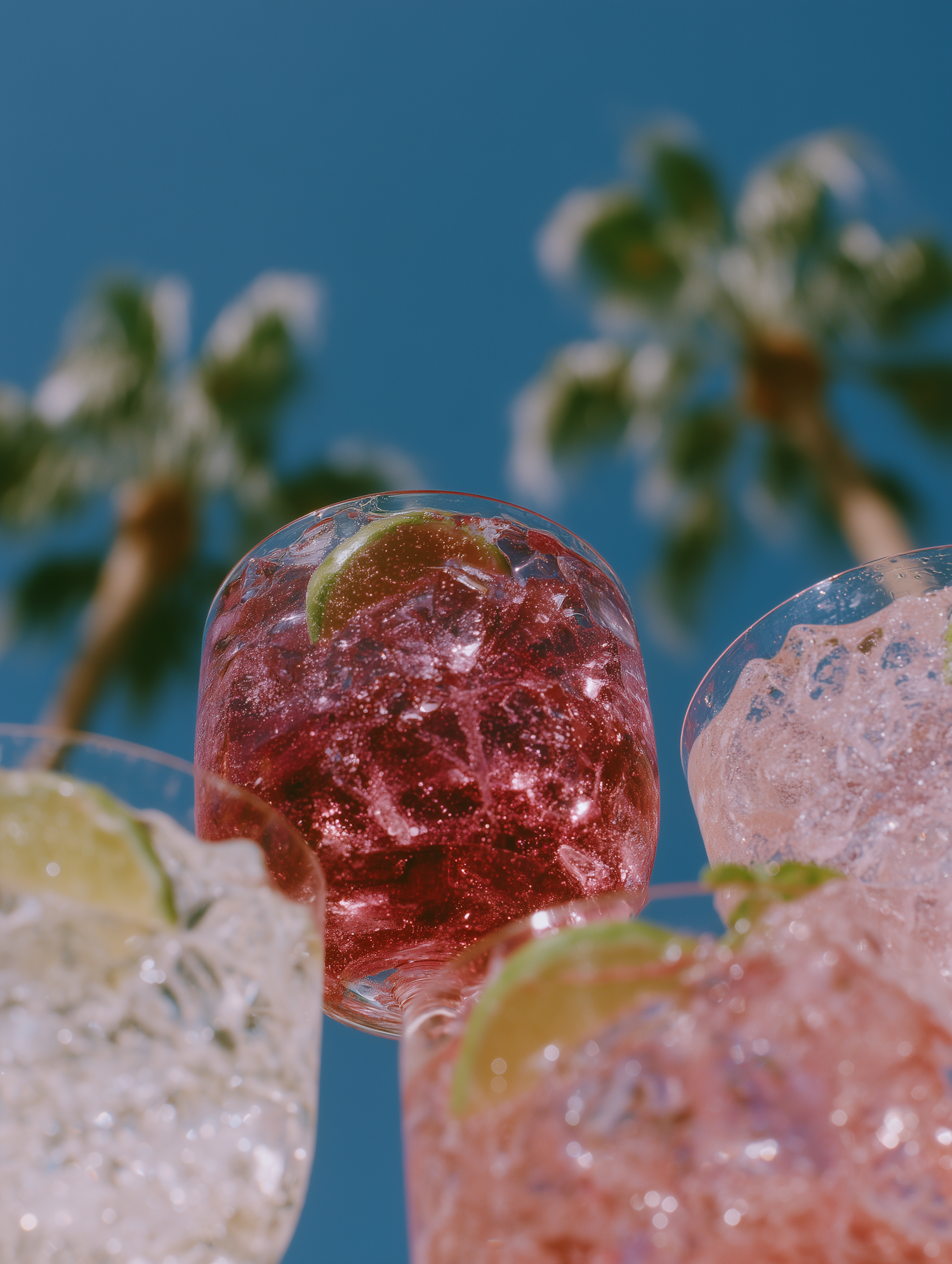 Colorful drinks with ice and lime slices sparkle under a sunny sky, with palm trees in the background, evoking a tropical summer vibe.
