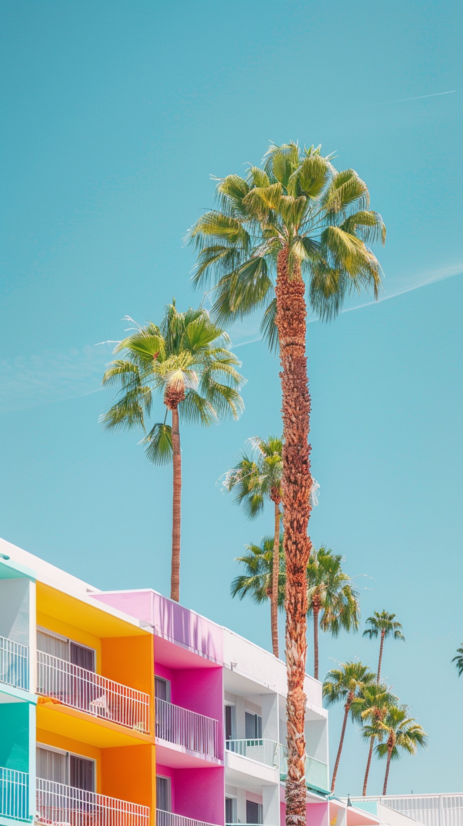 Vibrant palm trees and colorful building under a clear blue sky, creating a lively tropical atmosphere.