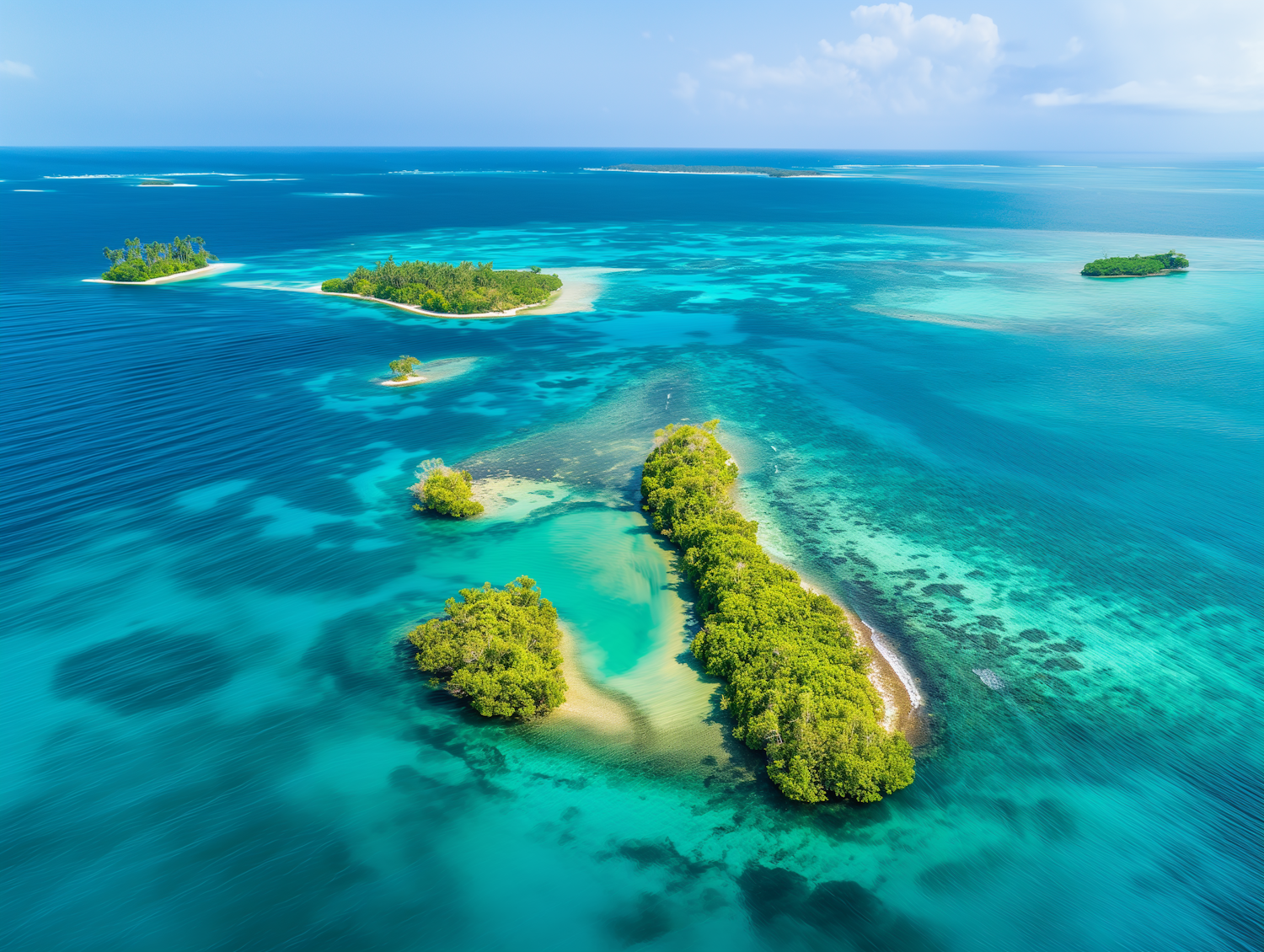 Aerial view of lush tropical islands surrounded by vibrant turquoise waters and clear blue skies, creating a serene seascape.
