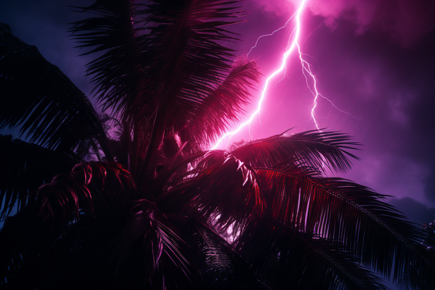 Vivid lightning strikes through a stormy sky, illuminating palm trees in a surreal pink and purple glow.