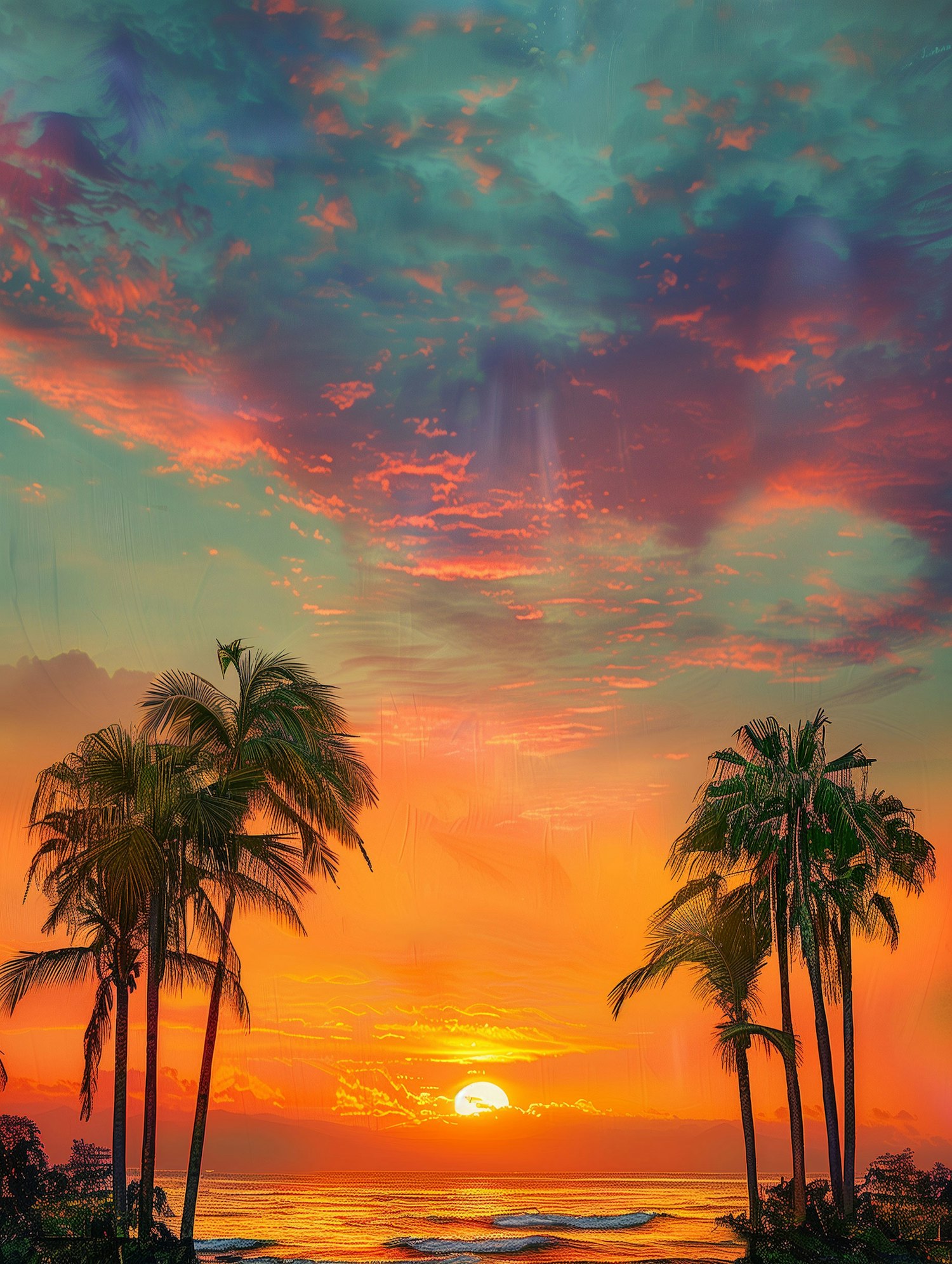 Vibrant sunset with palm trees silhouetted against a colorful sky, reflecting on the ocean waves. Serene tropical scene.