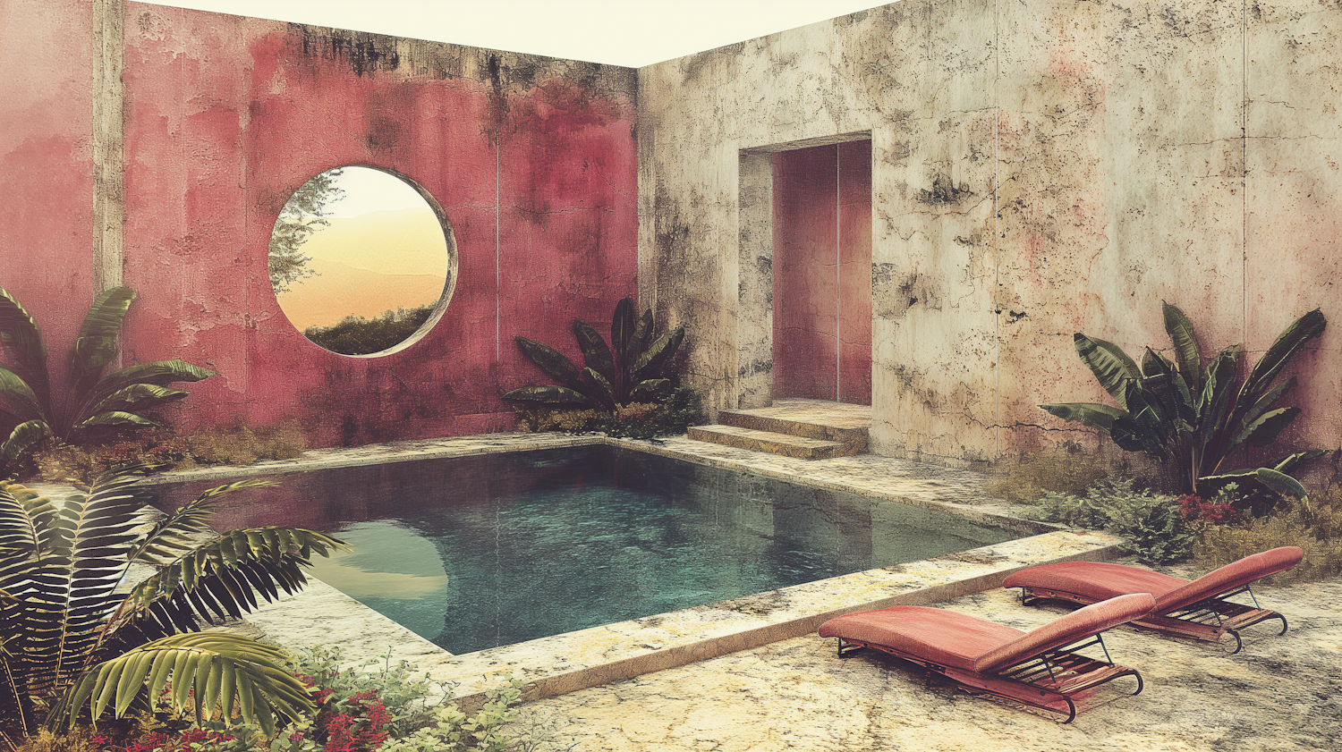 Tranquil courtyard with a pool, red lounge chairs, and lush greenery. A circular window reveals a golden sunset view.