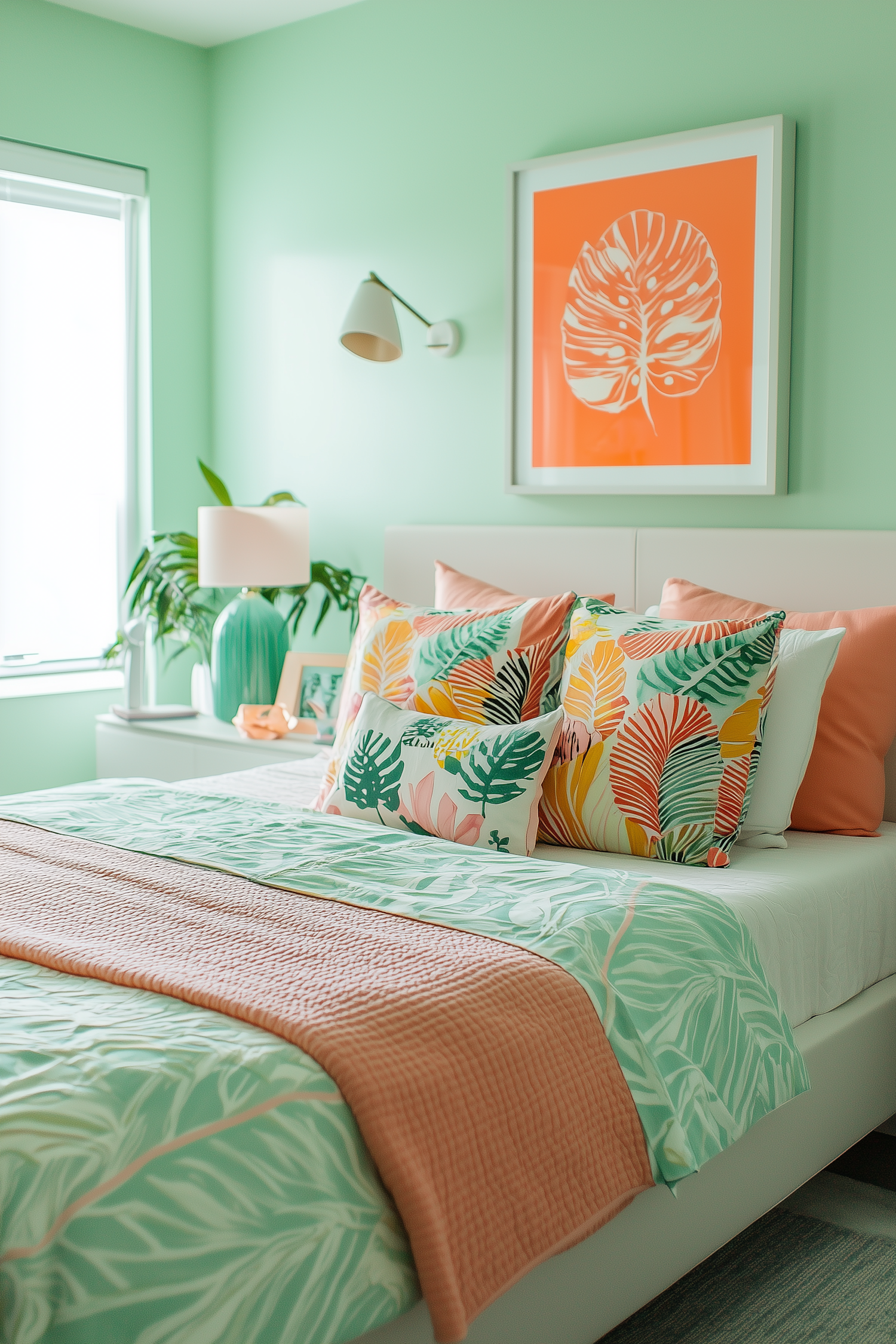 Bright tropical-themed bedroom with mint green walls, colorful leaf-patterned bedding, and vibrant orange wall art for a fresh, lively look.