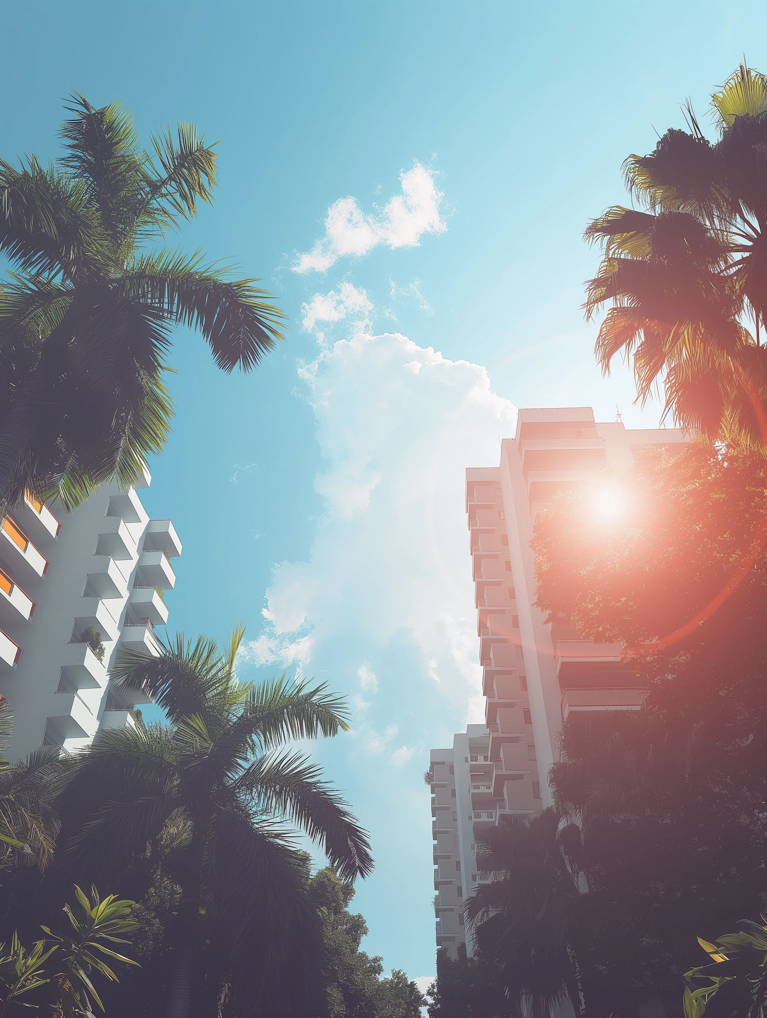Modern apartment buildings and palm trees under a bright blue sky with sunlight and clouds, creating a tropical urban vibe.