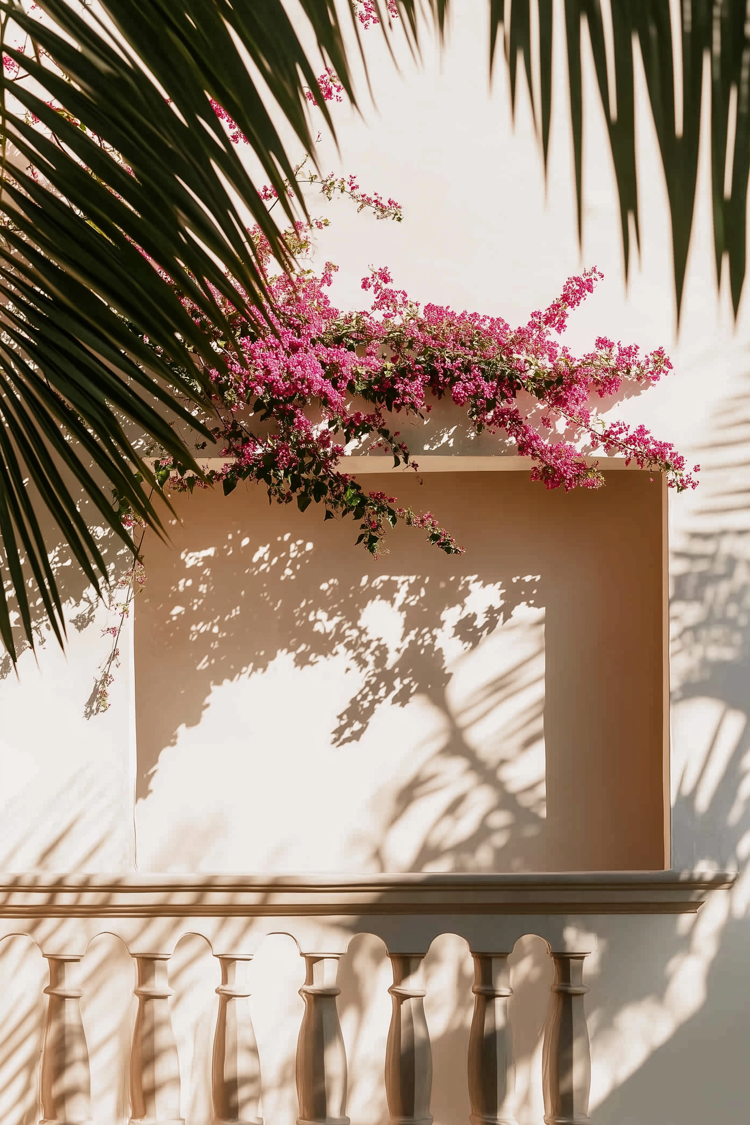 Pink bougainvillea cascades over a beige stucco wall, framed by palm frond shadows and a classic balustrade for a tropical, serene vibe.