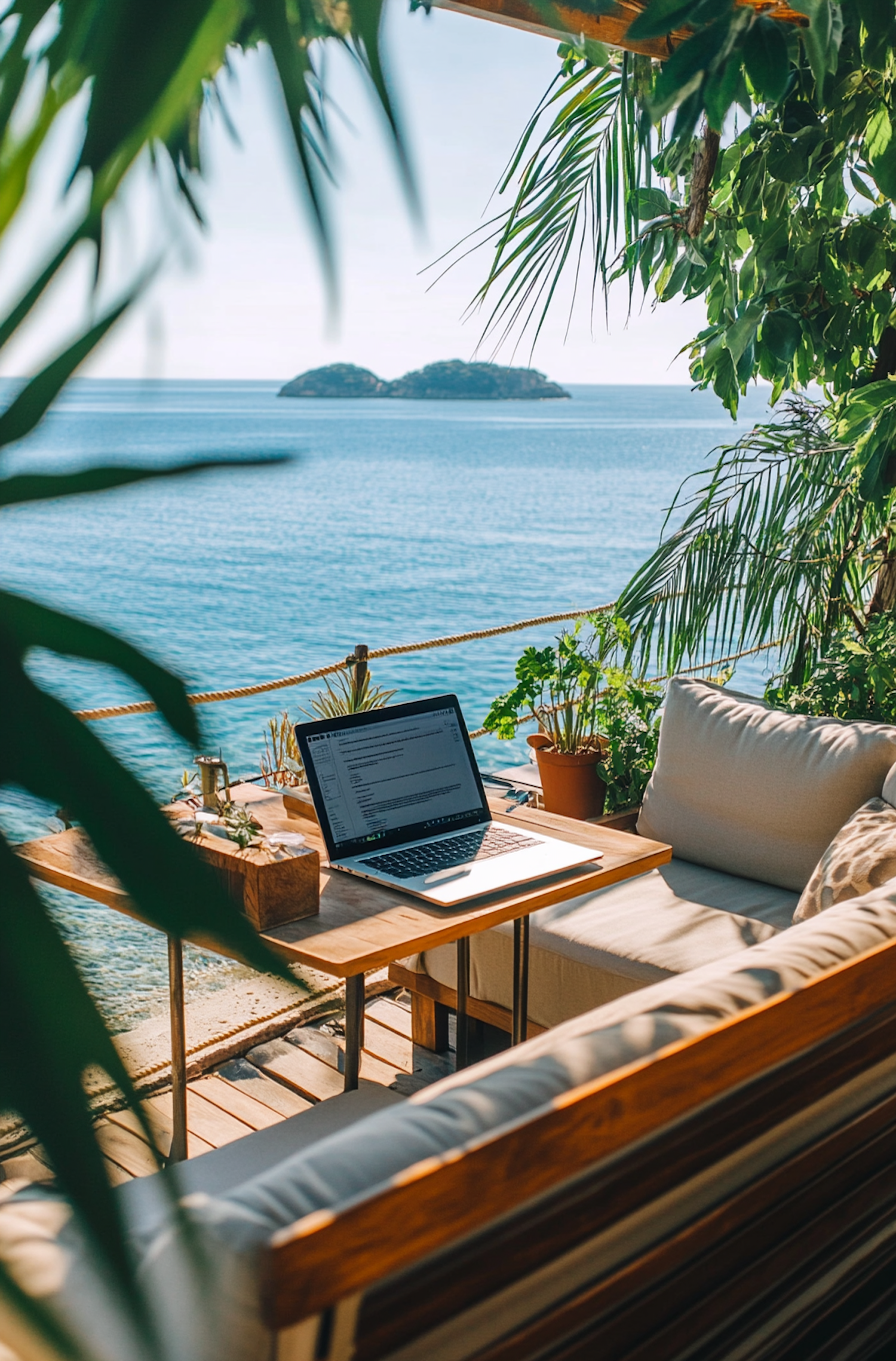 A cozy outdoor workspace with a laptop, plants, and ocean view, perfect for remote work or relaxation in a tropical setting.