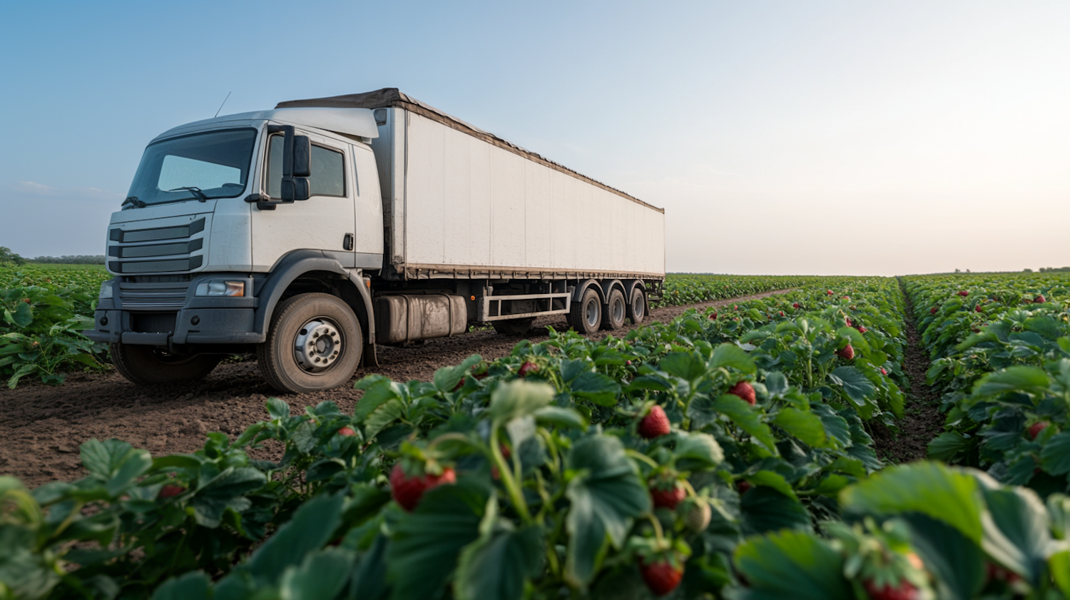 White truck parked beside a lush strawberry field under a clear sky, ready for agricultural transport.