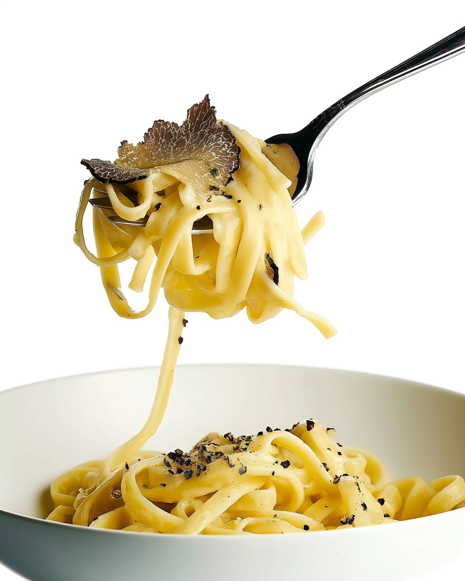 Creamy fettuccine pasta topped with black truffle shavings and cracked pepper, lifted by a fork for a gourmet close-up.