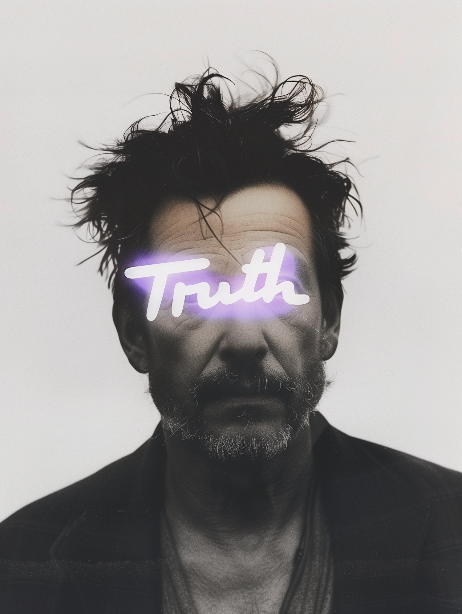 Black and white portrait with 'Truth' glowing across the eyes, blending classic and modern art styles.