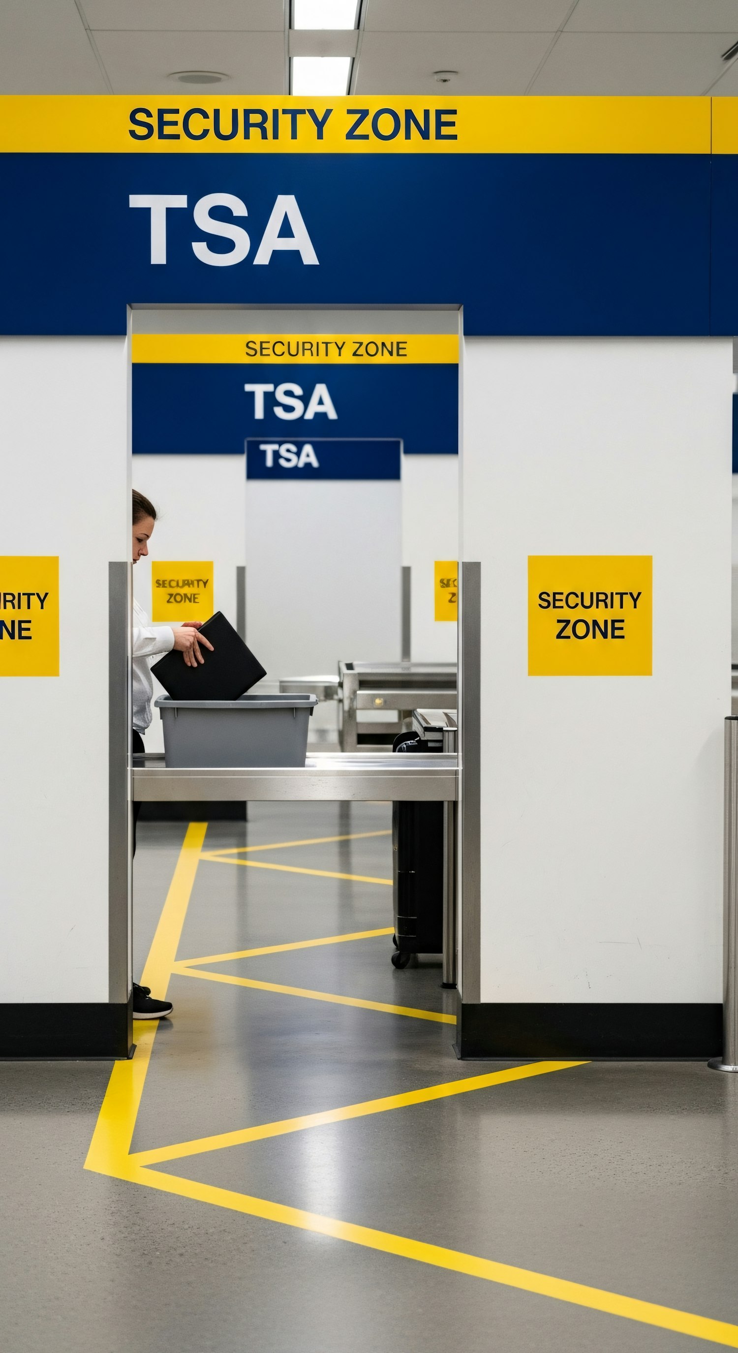 TSA security checkpoint with clear signage, a person placing an item in a bin, and organized pathways marked with yellow lines.