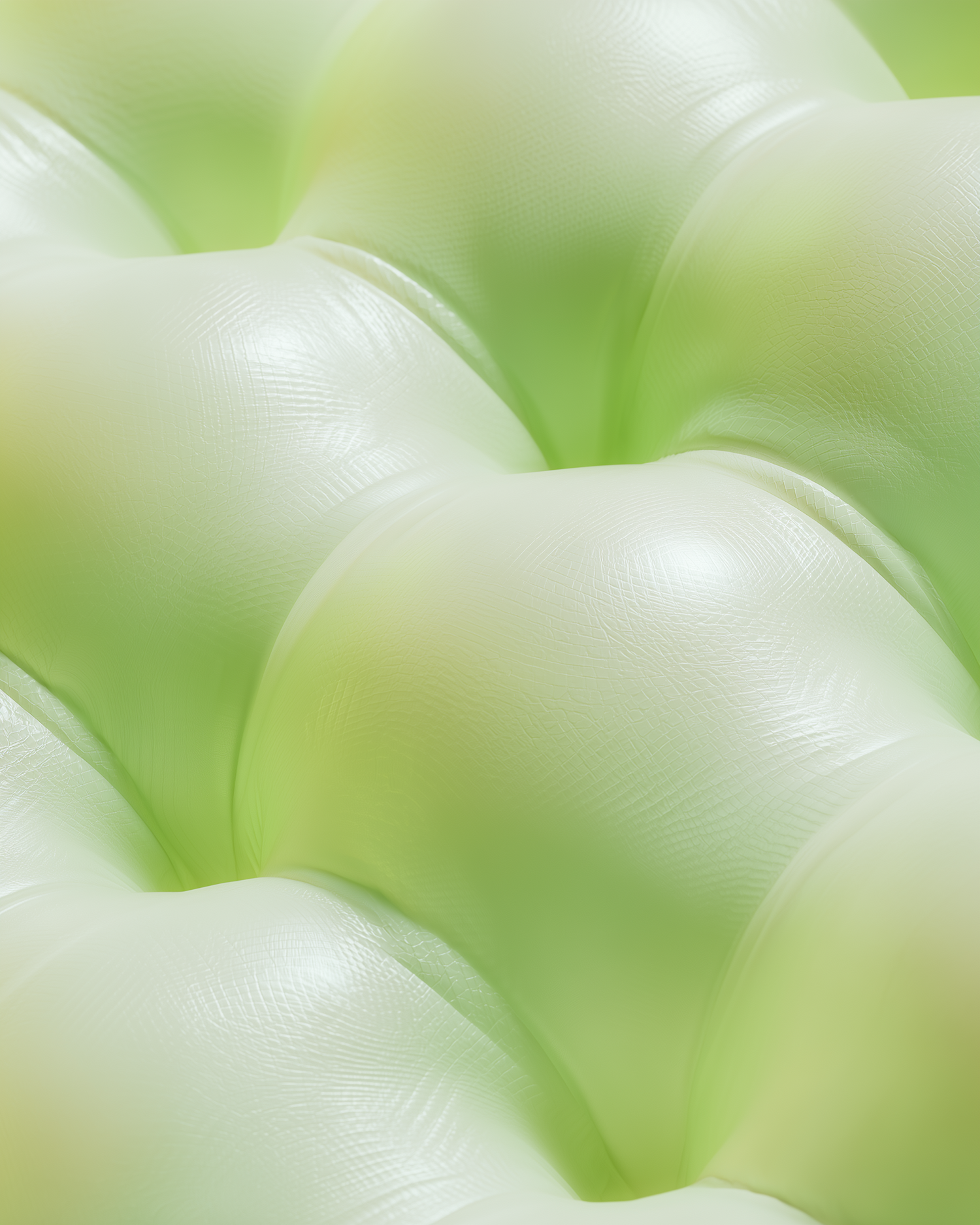 Close-up of a light green tufted surface with a glossy texture, showcasing its soft, cushioned appearance and subtle reflective details.
