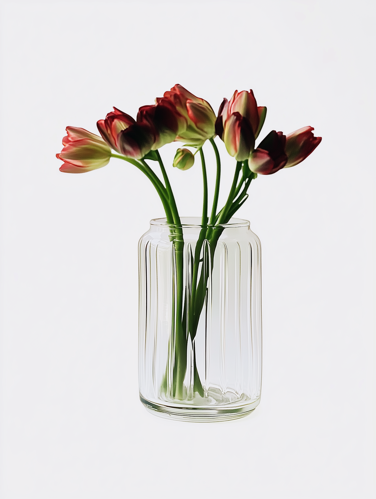 Elegant tulips with red and white petals in a clear glass vase against a white background.