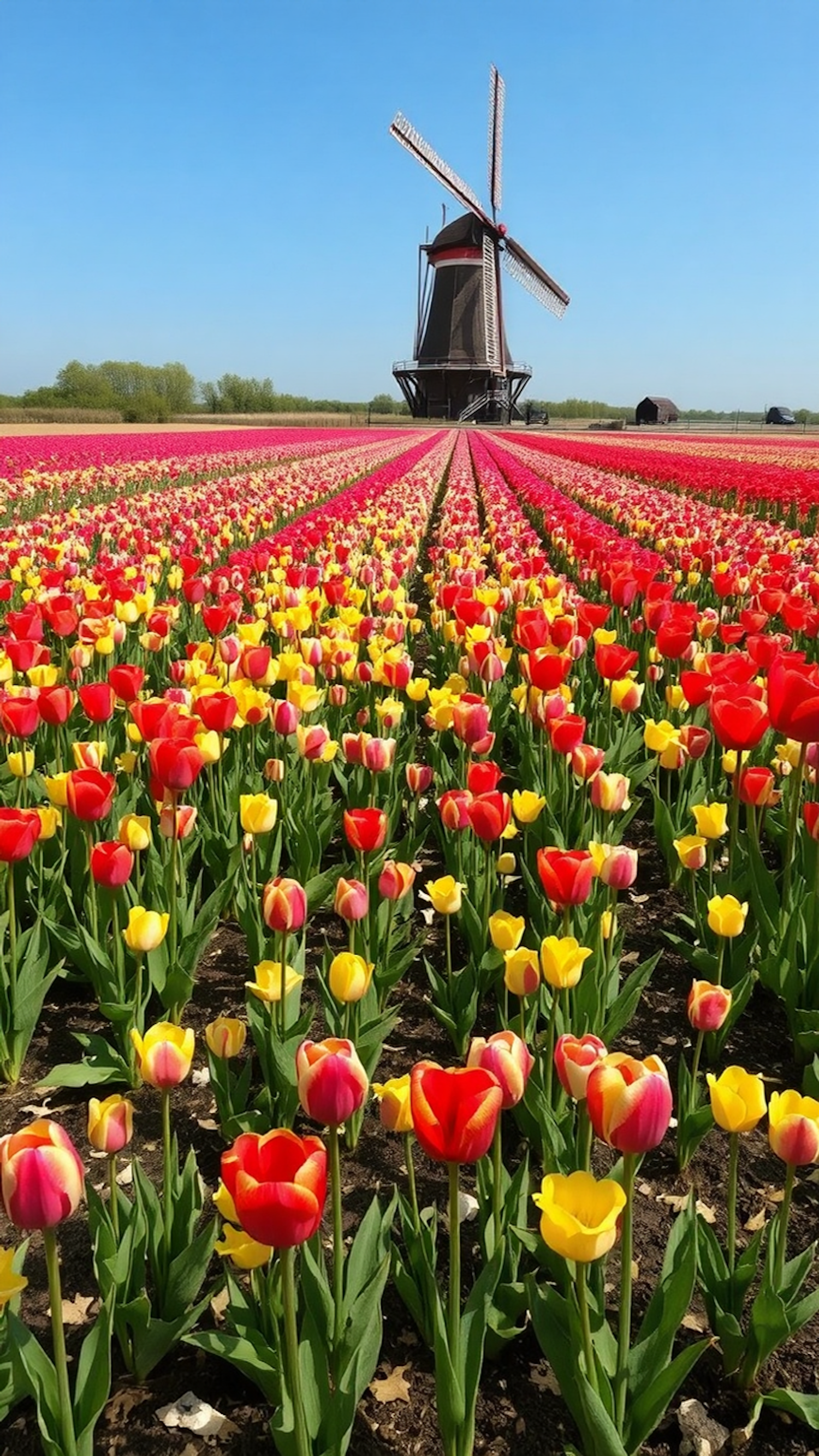 Vibrant tulip fields with red and yellow blooms lead to a classic Dutch windmill under a clear blue sky.