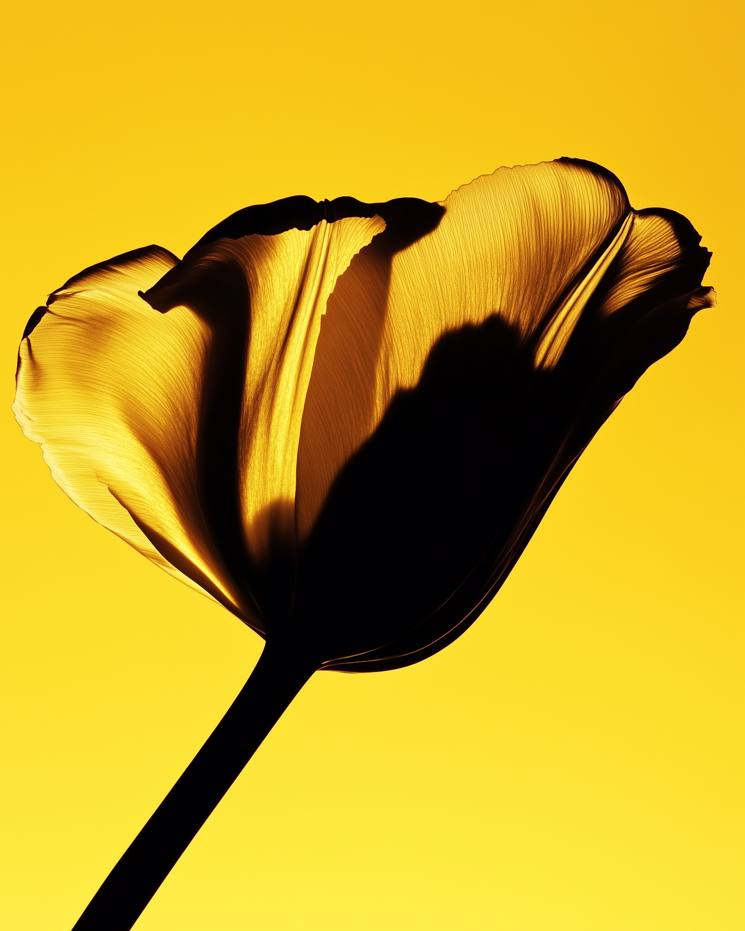 Silhouette of a tulip flower with backlit petals against a vibrant yellow background, showcasing delicate textures and bold contrasts.