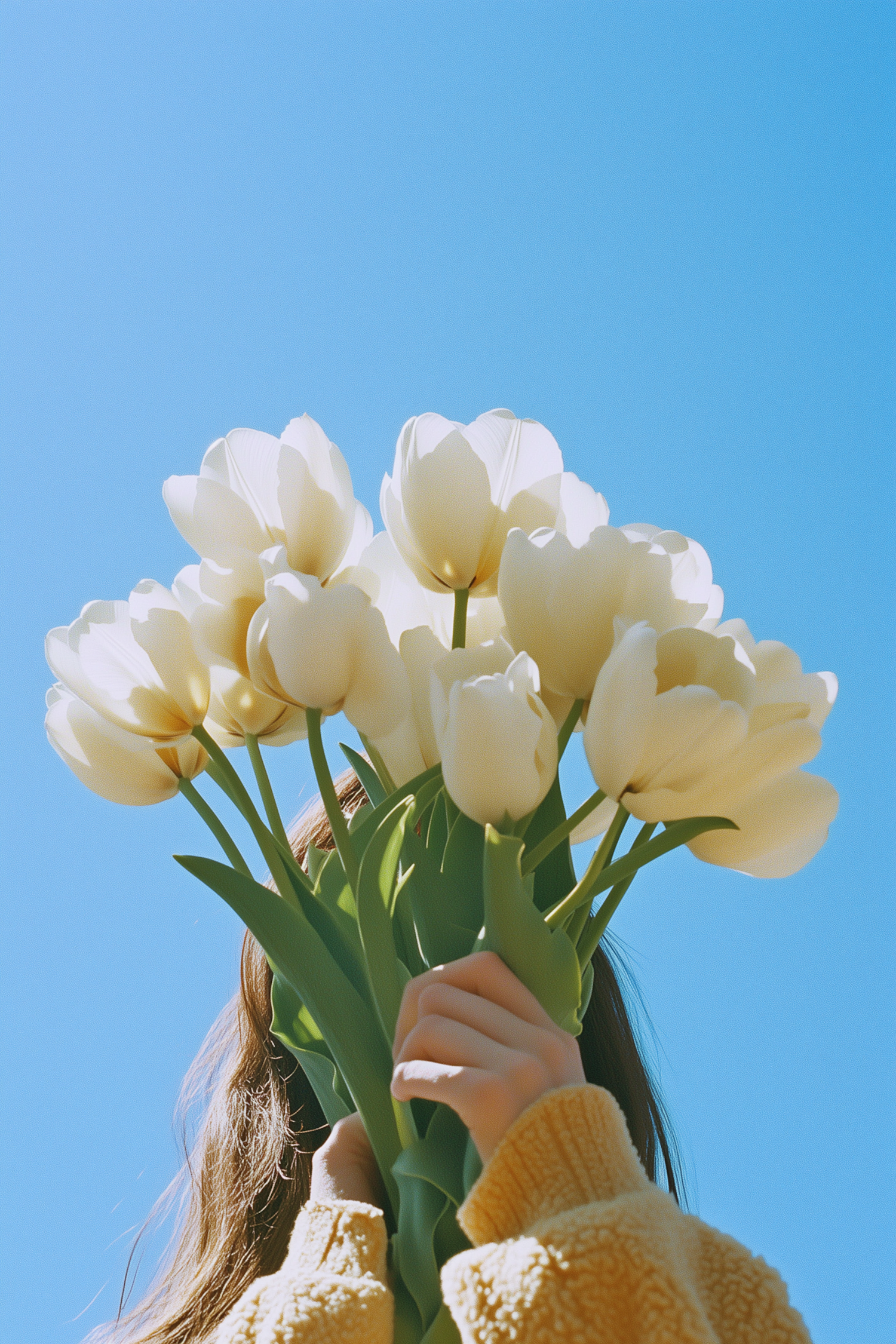 A bouquet of white tulips held by hands in a yellow sweater against a bright blue sky, creating a vibrant and serene composition.