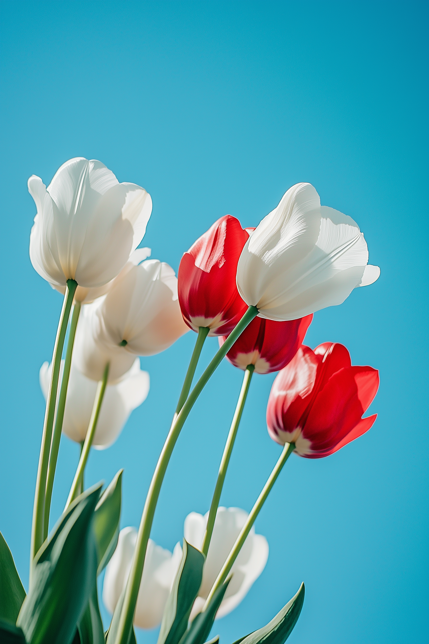 Bright red and white tulips against a clear blue sky, captured from below with sunlight highlighting their delicate petals.