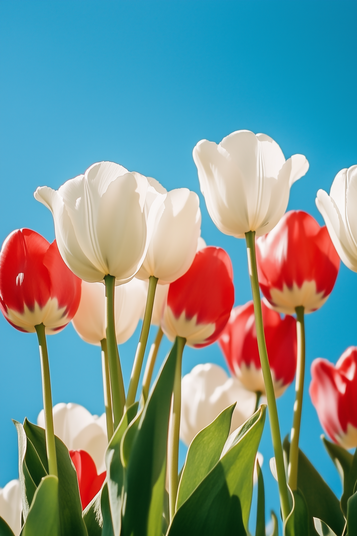 Bright red and white tulips in full bloom against a clear blue sky, showcasing vibrant colors and a fresh springtime vibe.