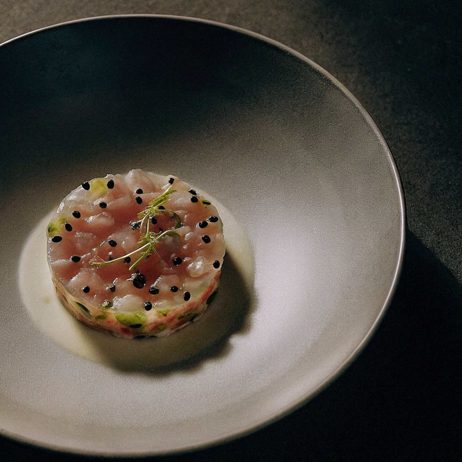 Elegant tuna tartare with black sesame seeds, microgreens, and creamy sauce, beautifully plated in a dark matte bowl.