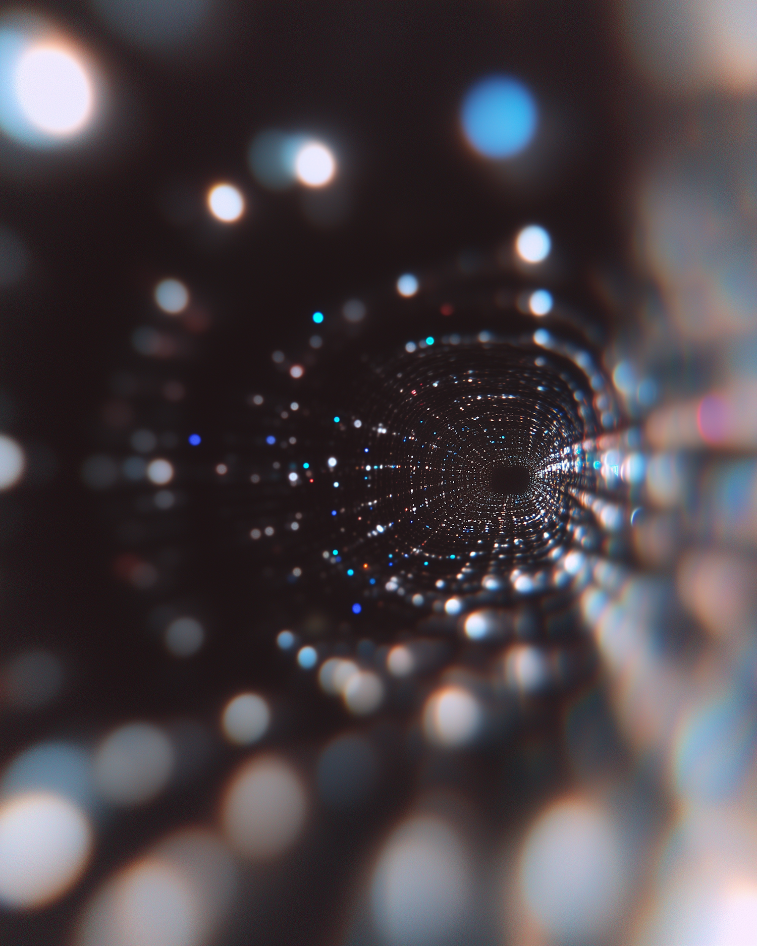 Abstract tunnel of light with circular bokeh effects in soft whites, blues, and warm tones, creating a dreamy and futuristic vibe.