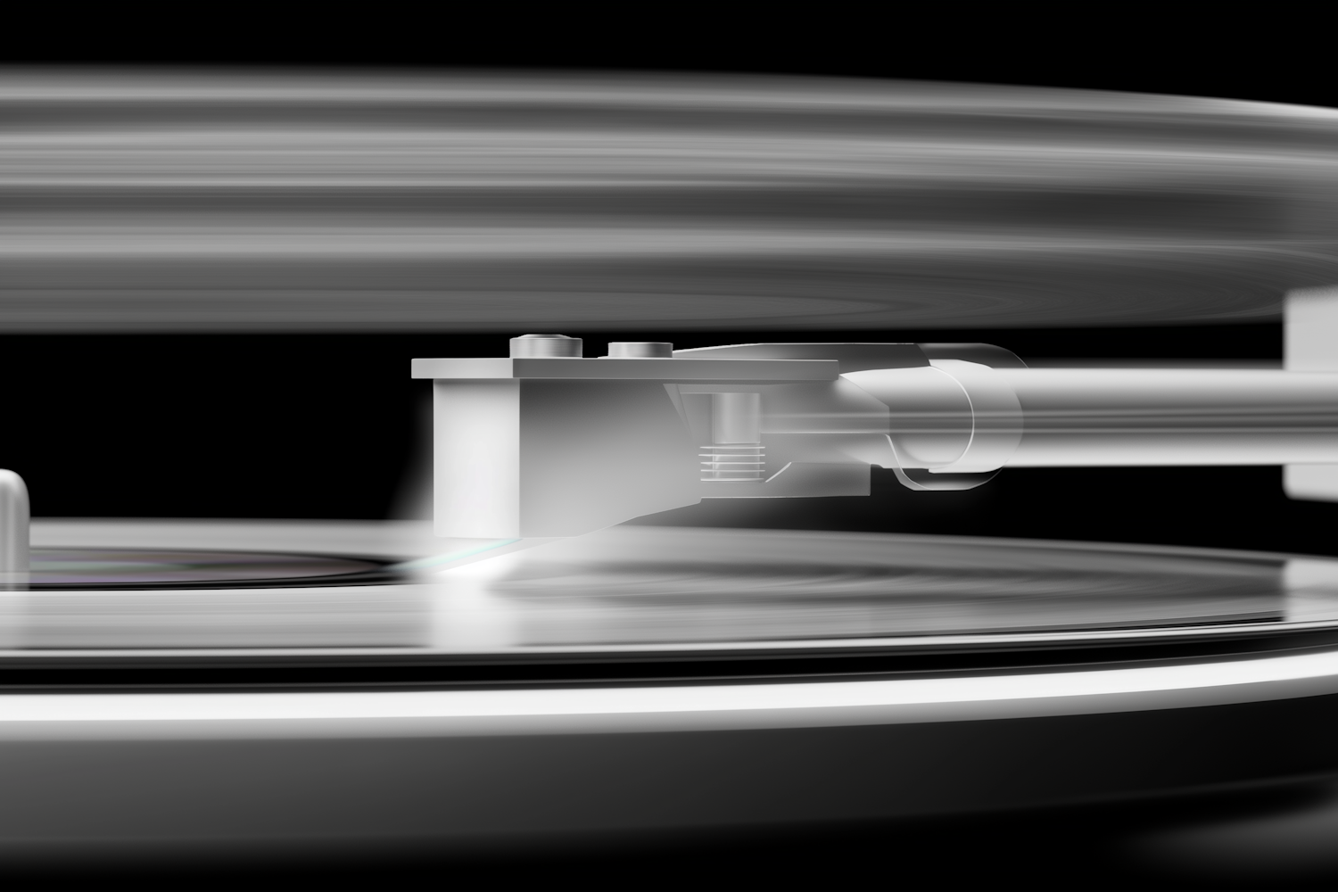 Close-up of a turntable stylus playing a spinning vinyl record, showcasing the sleek design and dynamic motion of the setup.