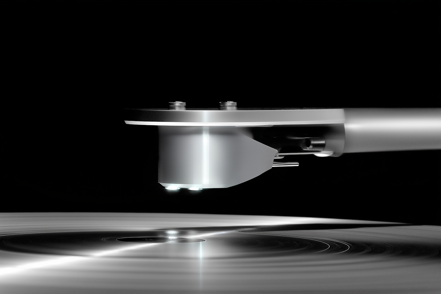Close-up of a turntable stylus arm over a spinning vinyl record, showcasing the sleek design and intricate grooves of the record.