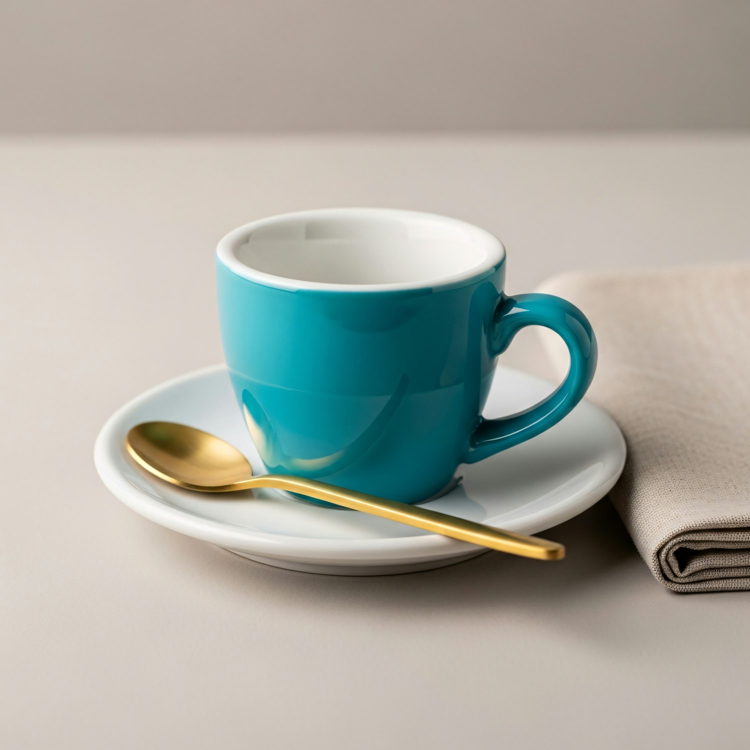 Turquoise coffee cup on a white saucer with a golden spoon, set against a beige background with a folded napkin for a cozy vibe.
