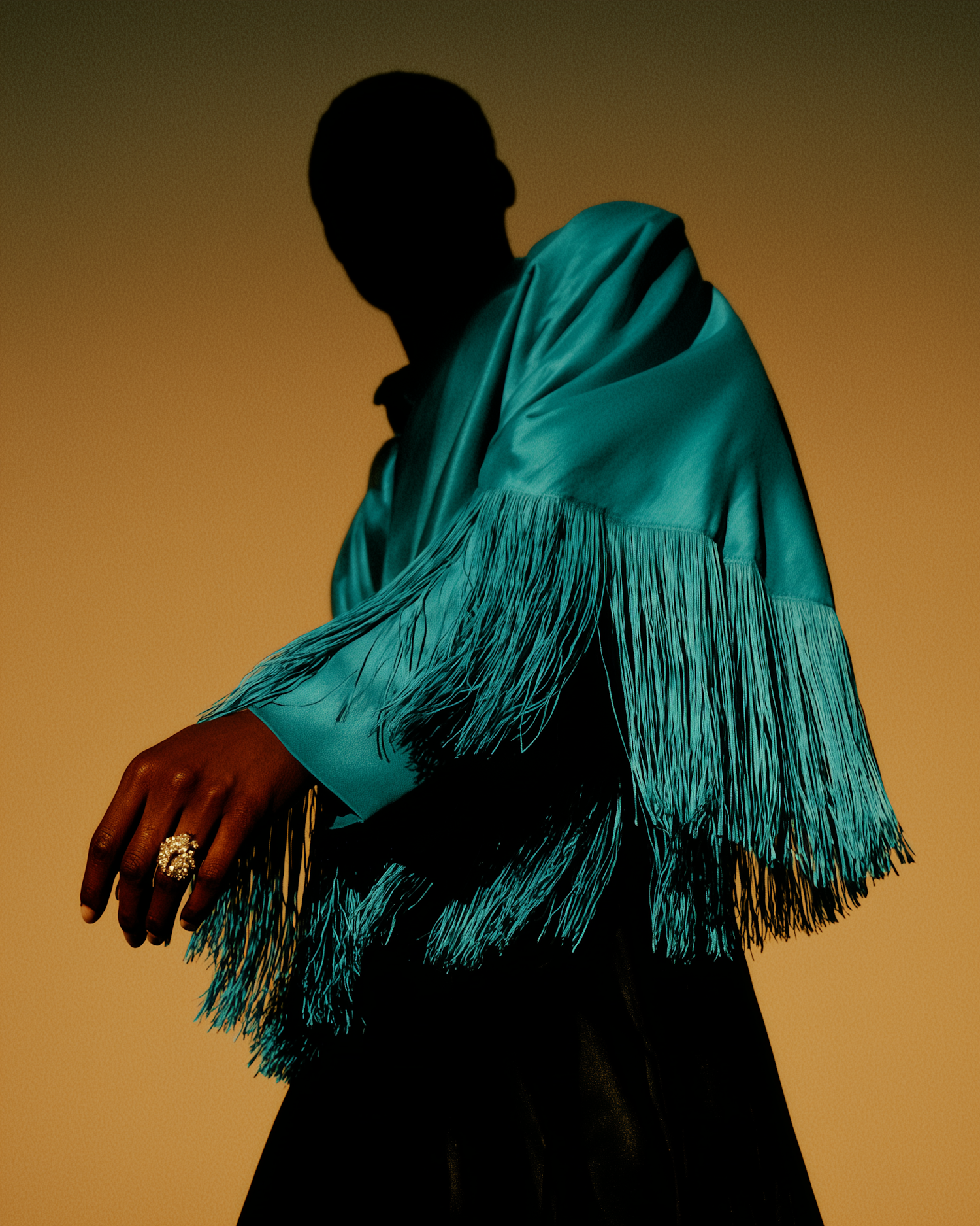A striking image of a person in a turquoise fringed outfit, with a warm gradient background and a focus on texture and elegance.