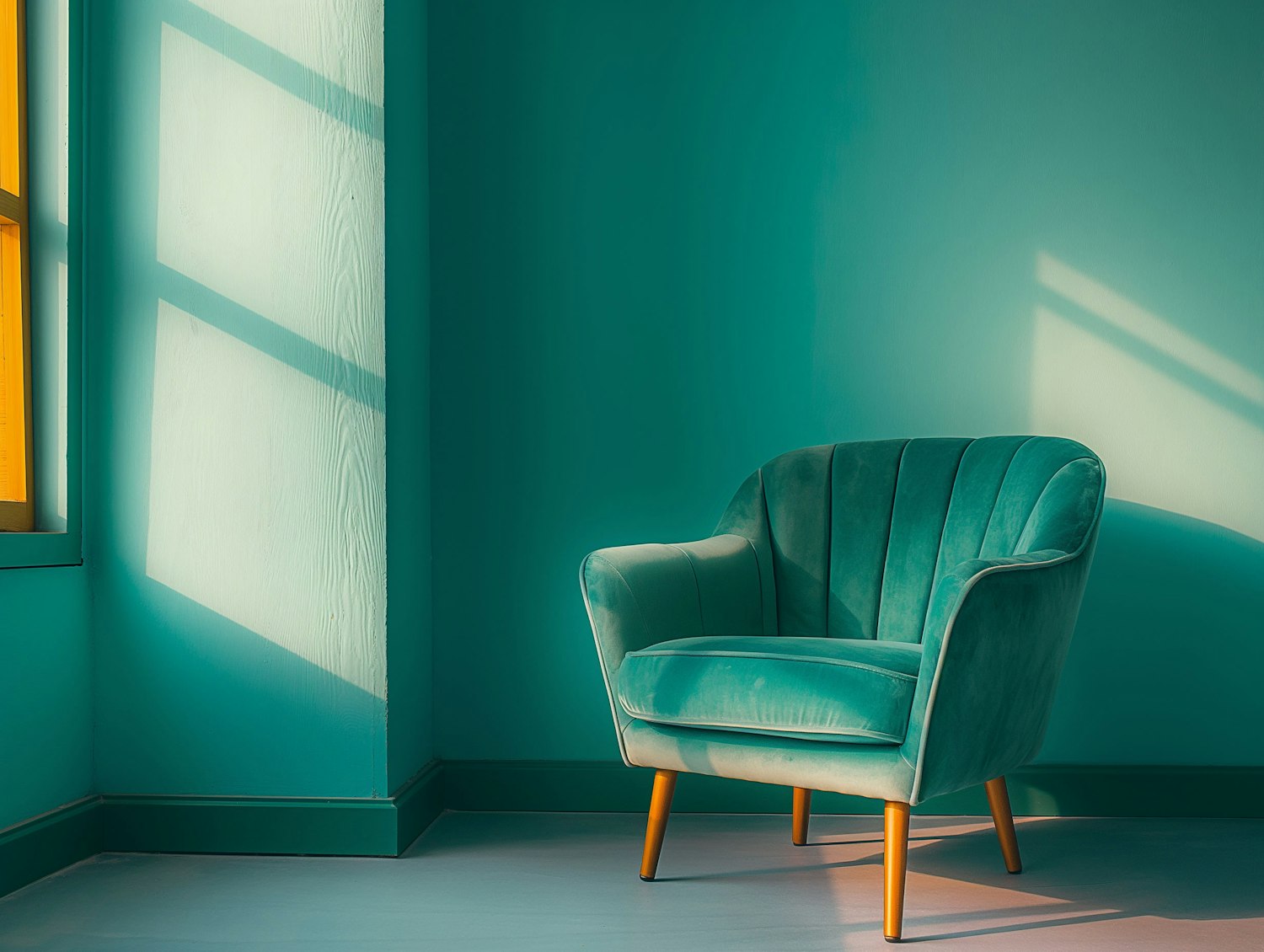 Teal armchair in a sunlit room with teal walls and a yellow window frame, creating a serene and stylish atmosphere.