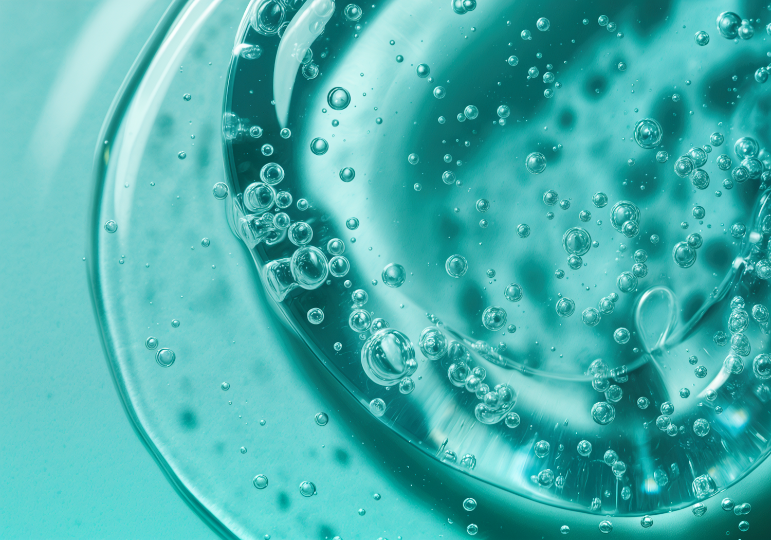 Close-up of turquoise gel with air bubbles, showcasing its glossy texture and vibrant color in an abstract composition.