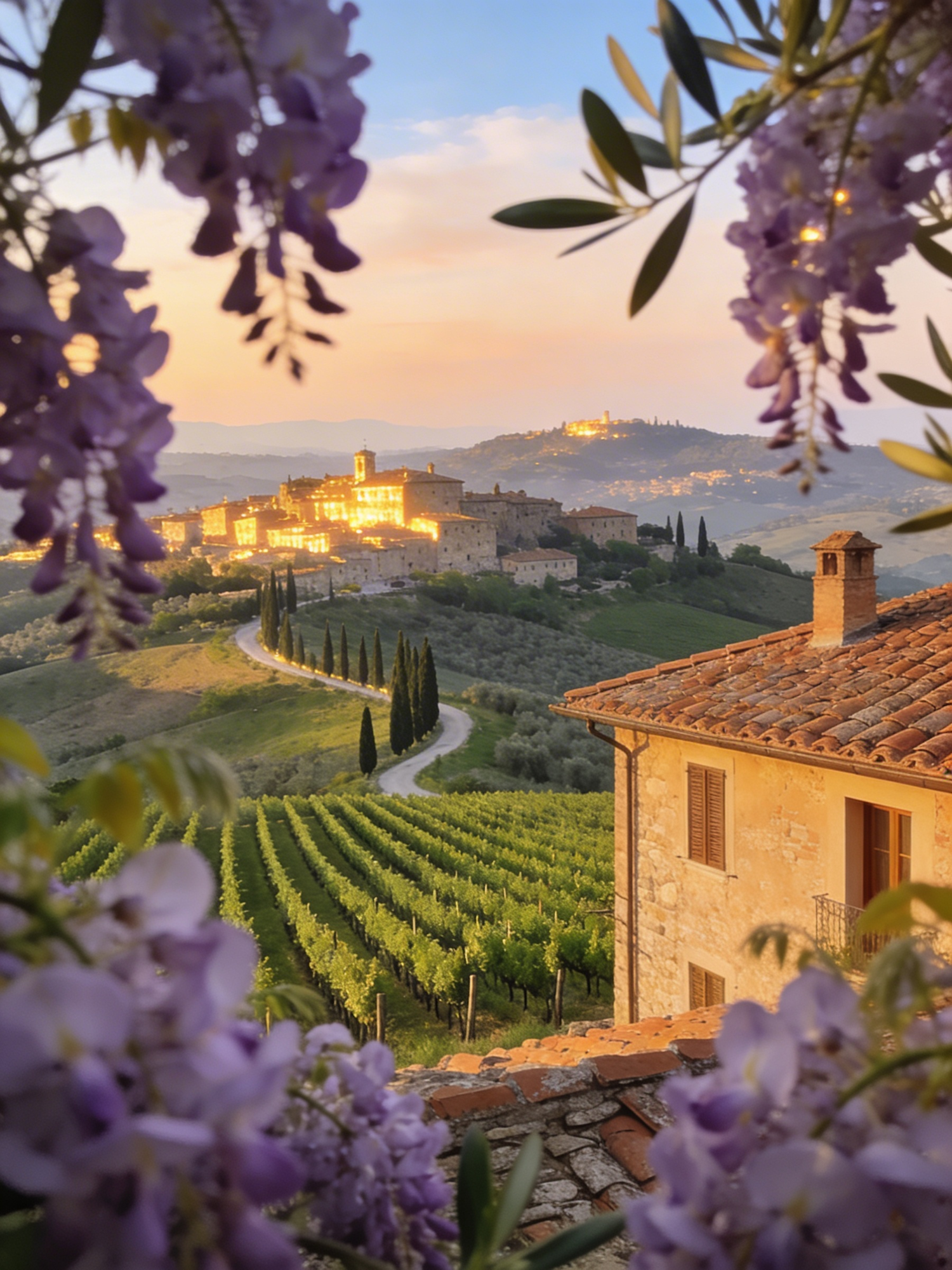 A stunning Tuscan sunset with vineyards, a rustic house, and a hilltop village framed by vibrant wisteria flowers.
