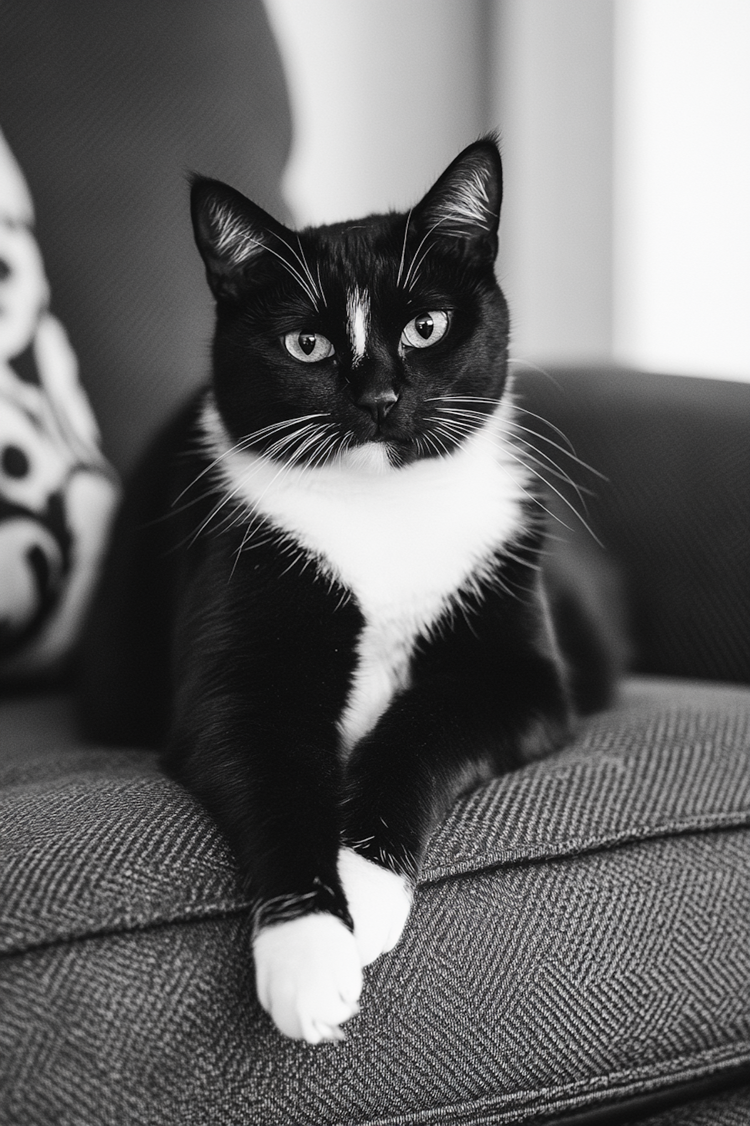 A poised black-and-white tuxedo cat sitting on a herringbone-patterned couch, gazing directly at the camera with bright, curious eyes.