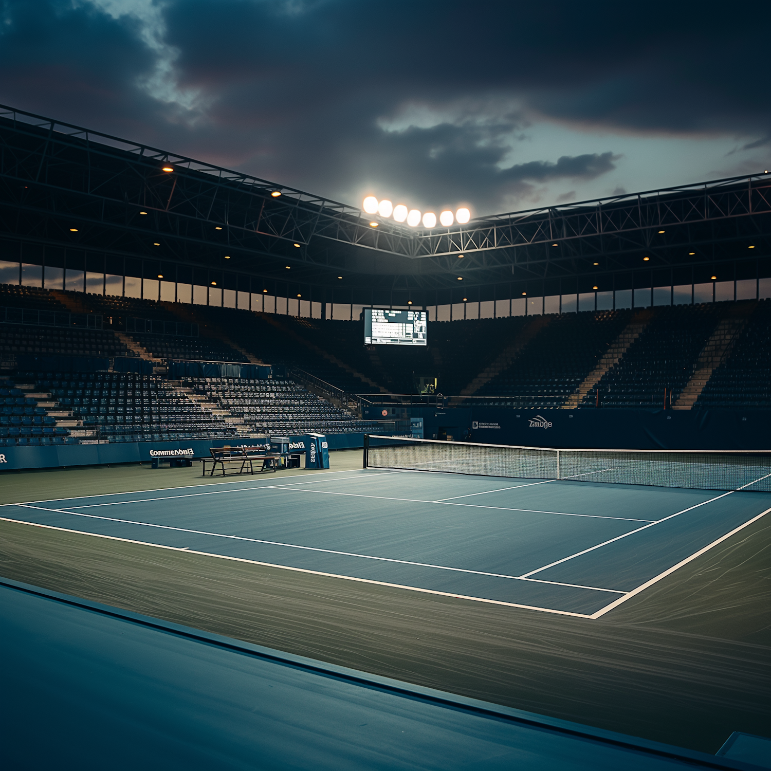 An empty tennis court under stadium lights, surrounded by empty seats and a darkening sky, creating a serene and anticipatory atmosphere.