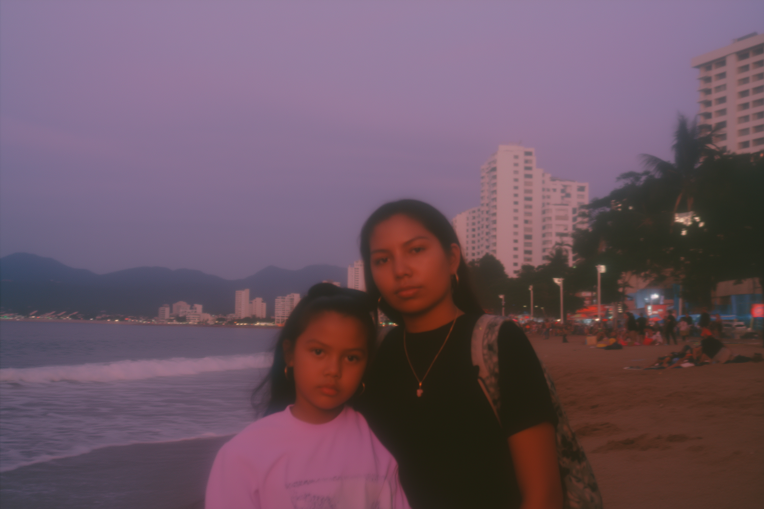 A young girl and woman stand on a twilight beach with a cityscape and mountains in the background under a purple-pink sky.