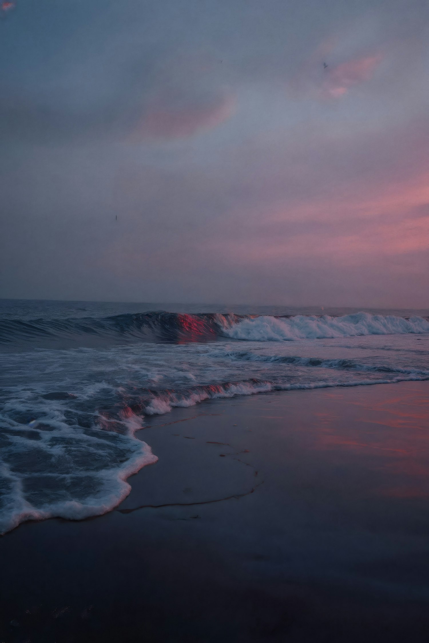 A serene beach at twilight with waves reflecting pink and blue hues from the sunset, creating a tranquil and picturesque scene.