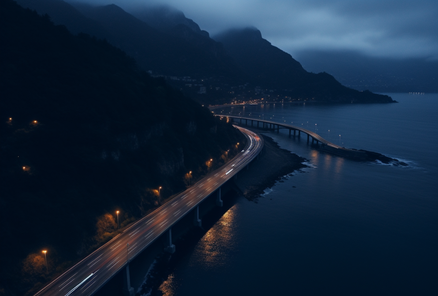 A winding coastal highway illuminated at night, with mountains and a calm sea creating a serene and mysterious atmosphere.