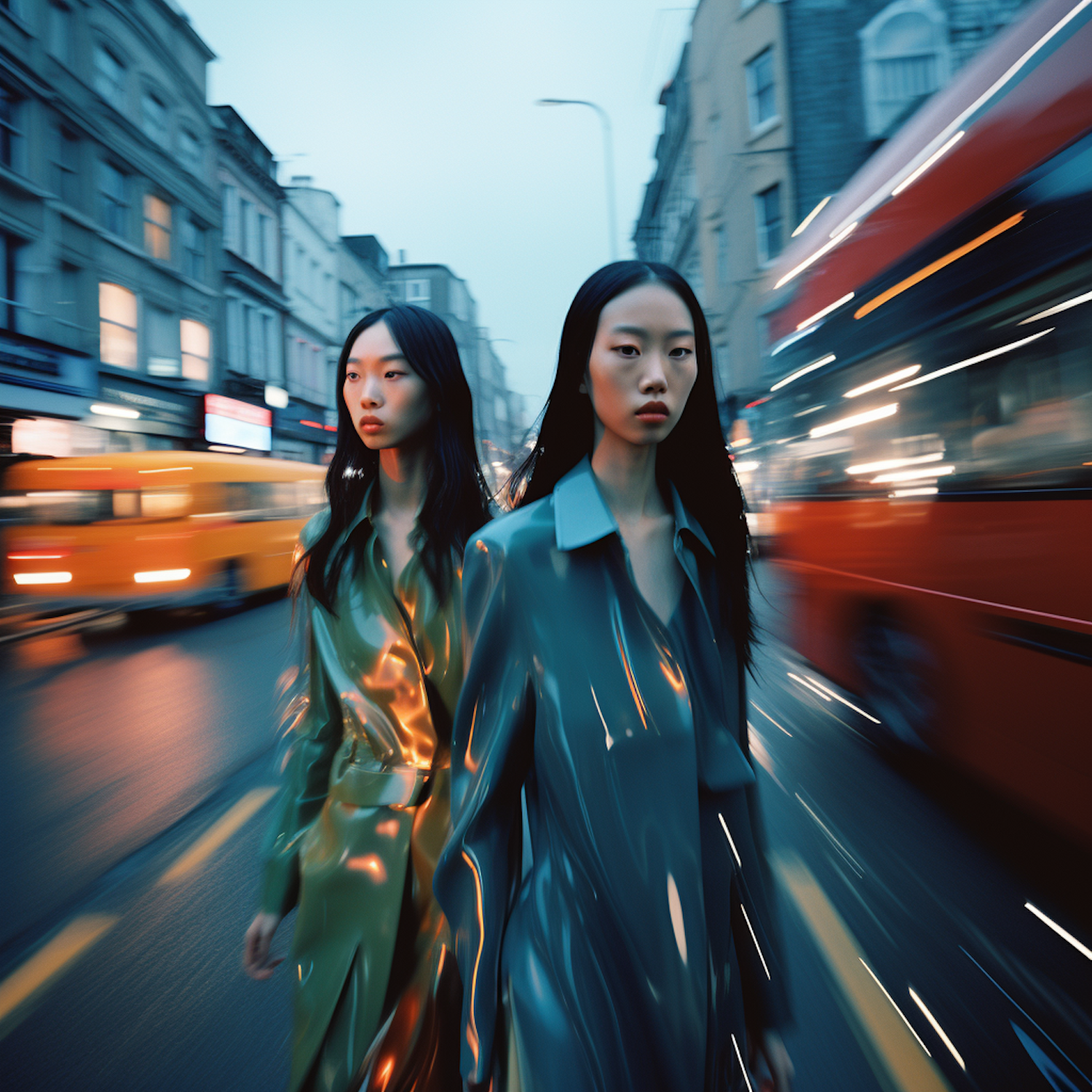 Two individuals in reflective coats walk through a vibrant city street with blurred motion of vehicles, creating a dynamic urban scene.